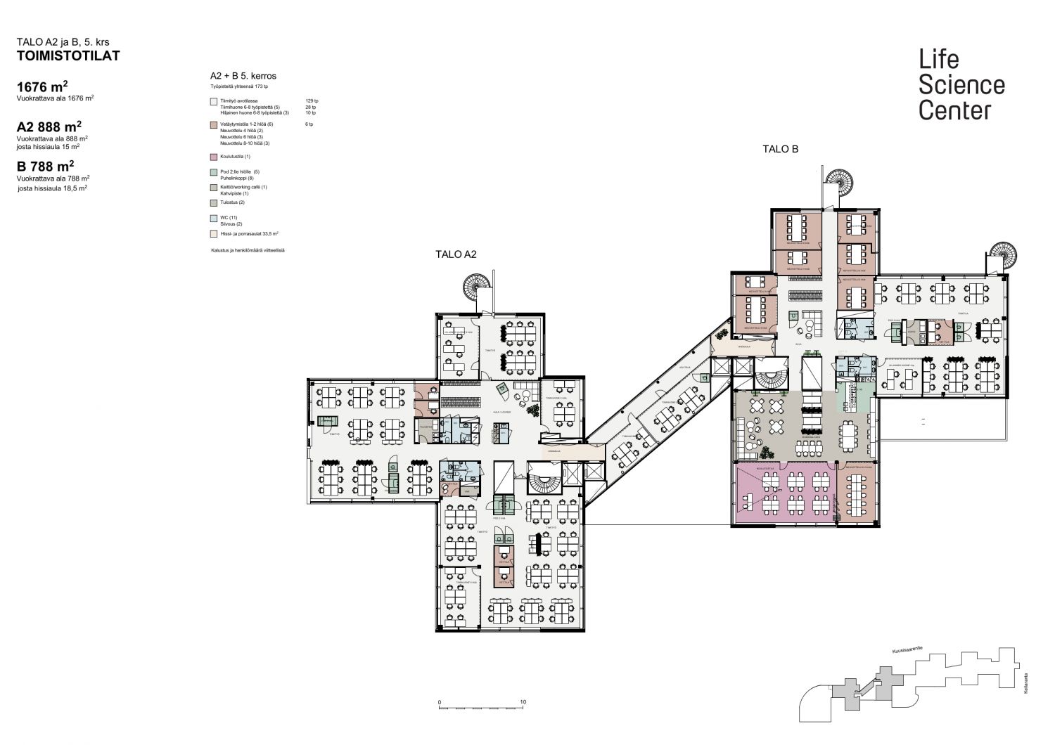 Life Science Center Keilaniemessä modernia uutta business park toimistotilaa kattavilla palveluilla kerroksissa 5-7. Tilat ovat muunneltavia ja moderneja, hyvin ilmastoituja ja sijoittuneita. Kaikkiin rakennuksiin on pääsy sisäbulevardin kautta.Alueen yrityksillä on käytössään huolto-, kunnossapito- ja vartiointipalveluiden lisäksi erinomaiset tietoliikenneyhteydet, monipuoliset ravintola- ja catering-palvelut, aula- ja toimistopalvelut sekä nykyaikaiset kokous- ja edustustilat. Työntekijöiden käytössä on mm. kuntosali, kampaamo, kosmetologi, pesula, hieroja ja hammaslääkäri. Jokaisessa rakennuksessa on lisäksi omat sosiaaliset tilat suihkuineen. Hienot näköalat. Tiedonsiirtoluokka E/cat6