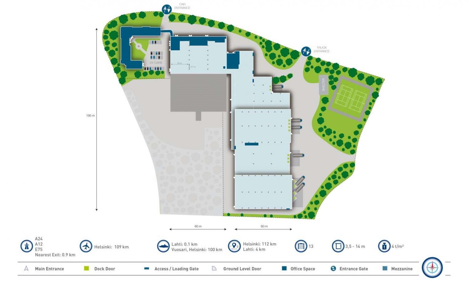Vuokrataan vain varastokäyttöön, ei liikunnalliseen tai vastaavaan käyttöön. Monipuolinen ja toimiva logistiikkakeskus / varastokiinteistö, joka on jaettavissa erikokoisiin osiin. Varastotilassa on useita lastauslaitureita, korkeita nosto-ovia ja raskaalle kuljetuskalustolle toimiva piha-alue. Varaston korkeus vaihtelee 3-14 metriin, mikä mahdollistaa suurien lavamäärien käsittelyn. Kiinteistössä on yhteensä n. 11.500 lavapaikkaa. Naapurissa toimii paloasema. Rakennuksessa on savuilmaisimet. Kiinteistö sijaitsee Lahden talousalueella Niemen venesatamaa vastapäätä. Sijainti on erinomainen suhteessa pääkaupunkiseutuun ja koko eteläiseen Suomeen sekä Pietariin. Välimatkat Lahden alueella ovat lyhyitä ja liikenneyhteydet hyvät. Helsinki ja Vuosaaren satama ovat vain noin 100 km päässä. Matkaa Lahden keskustaan on noin 4km. Lähialueella sijaitsee mm. lounasravintoloit ja Lahden Yrityspuisto. Suurella piha-alueella on runsaasti pysäköintipaikkoja.