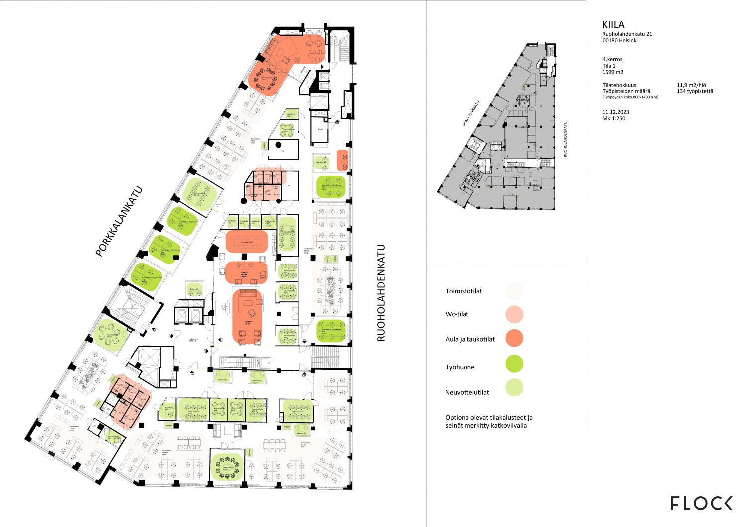 Joustavasti nopeastikin vapautuva neljännen kerroksen ilmeikäs kombitoimisto aivan ydinkeskustan kupeessa. Tila voidaan jakaa tarvittaessa pienempiin kokonaisuuksiin. Upeat näkymät niin Ruoholahden kuin Kampinkin suuntiin kauniista vastikää remontoiduista ruutuikkunoista. Keskellä uniikki valoaukollinen korkea tila isompiin henkilöstötilaisuuksiin tai julkistuksiin. Toimii myös upeana työskentely- tai taukotilana.