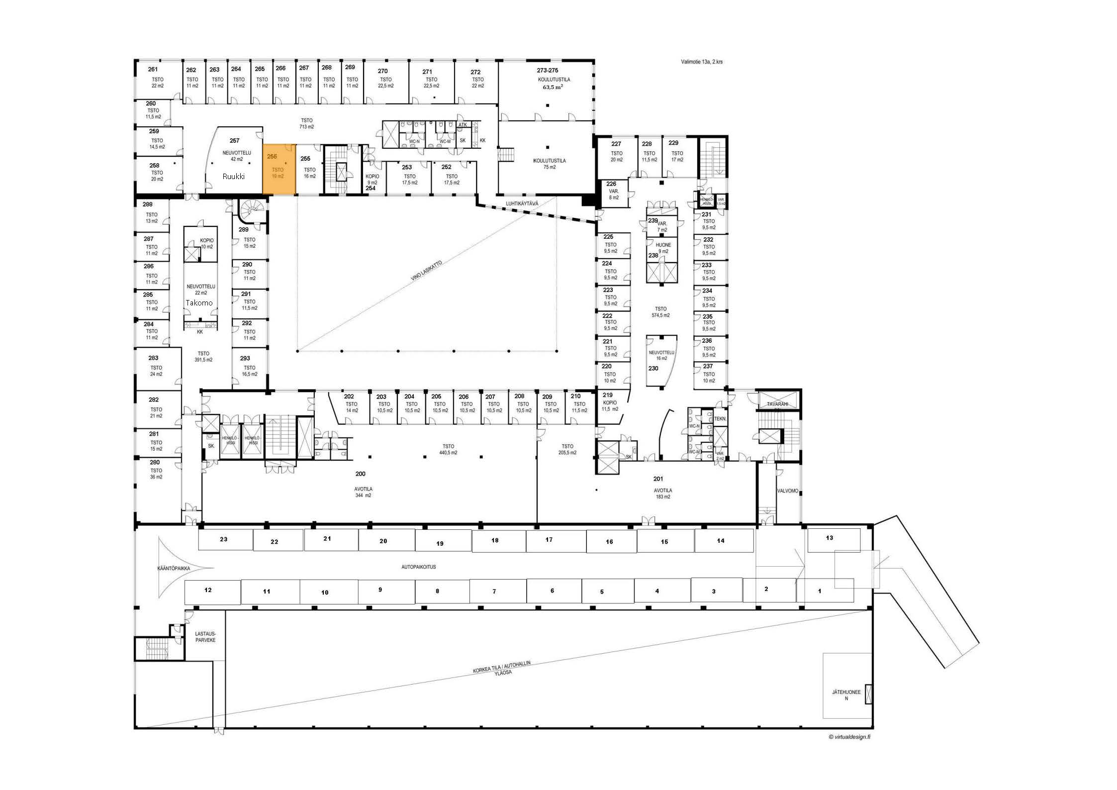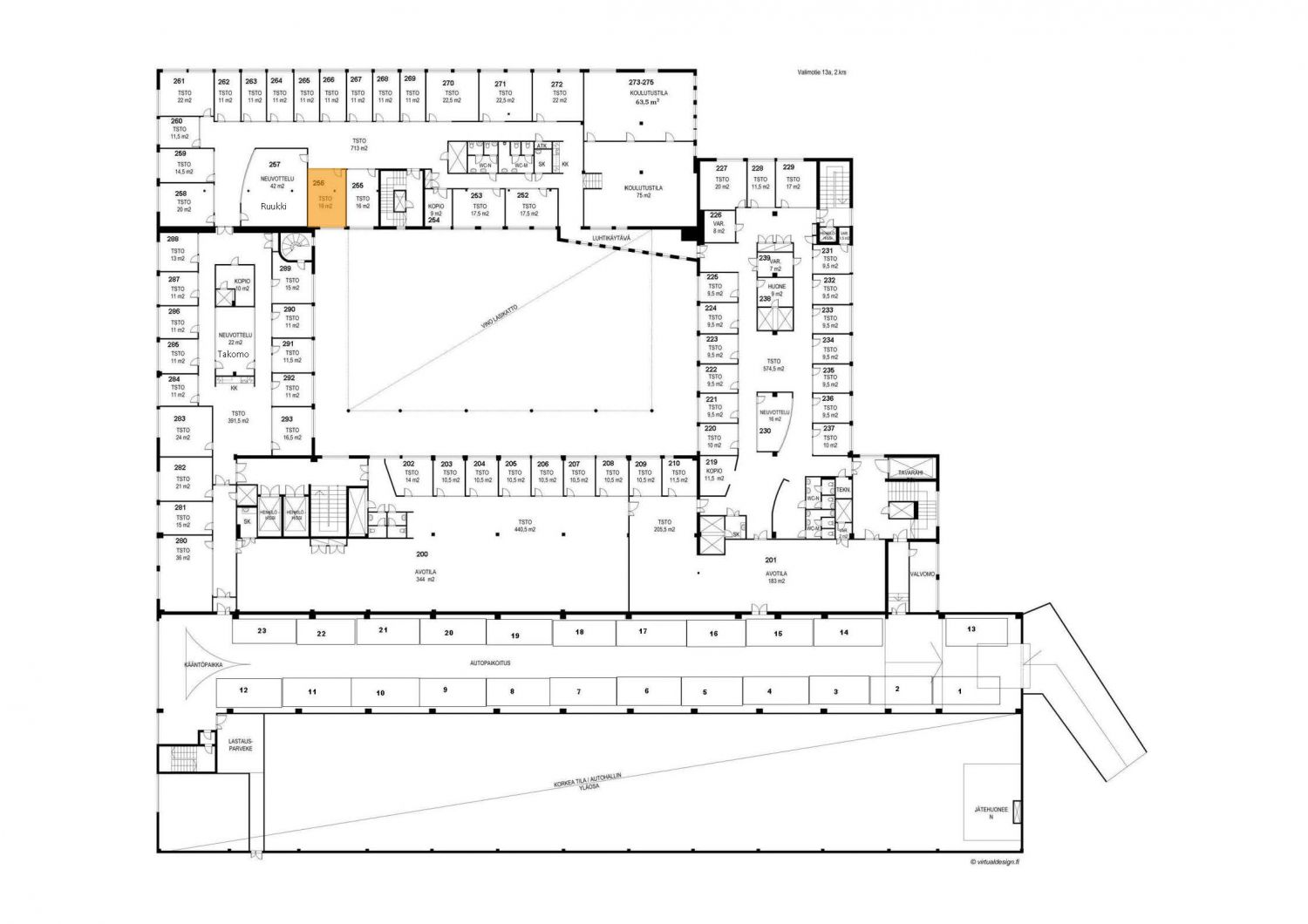 Yksityinen toimistohuone rakennuksen toisessa kerroksessa. Huone on lukittava ja vuokralaisen käytössä on Valimotie 13a yhteiset keittiö- ja taukotilat. Huoneesta on ikkuna katetulle sisäpihalle, jossa toimii ravintola Factory.