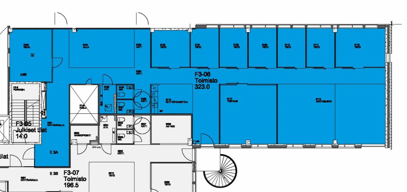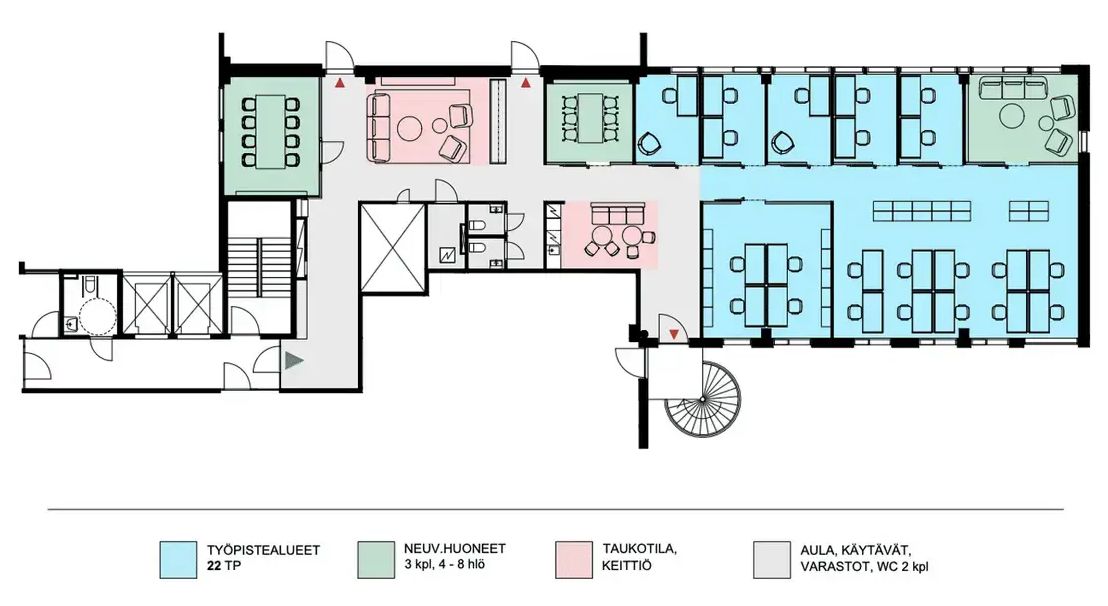 Toimisto soveltuu erinomaisesti niin monitilatoimistoksi noin 26 henkilölle kuin huonetoimistoksi noin 18 henkilölle. Henkilömäärät ovat suuntaa antavia arvioita ja riippuvat tilaratkaisusta.