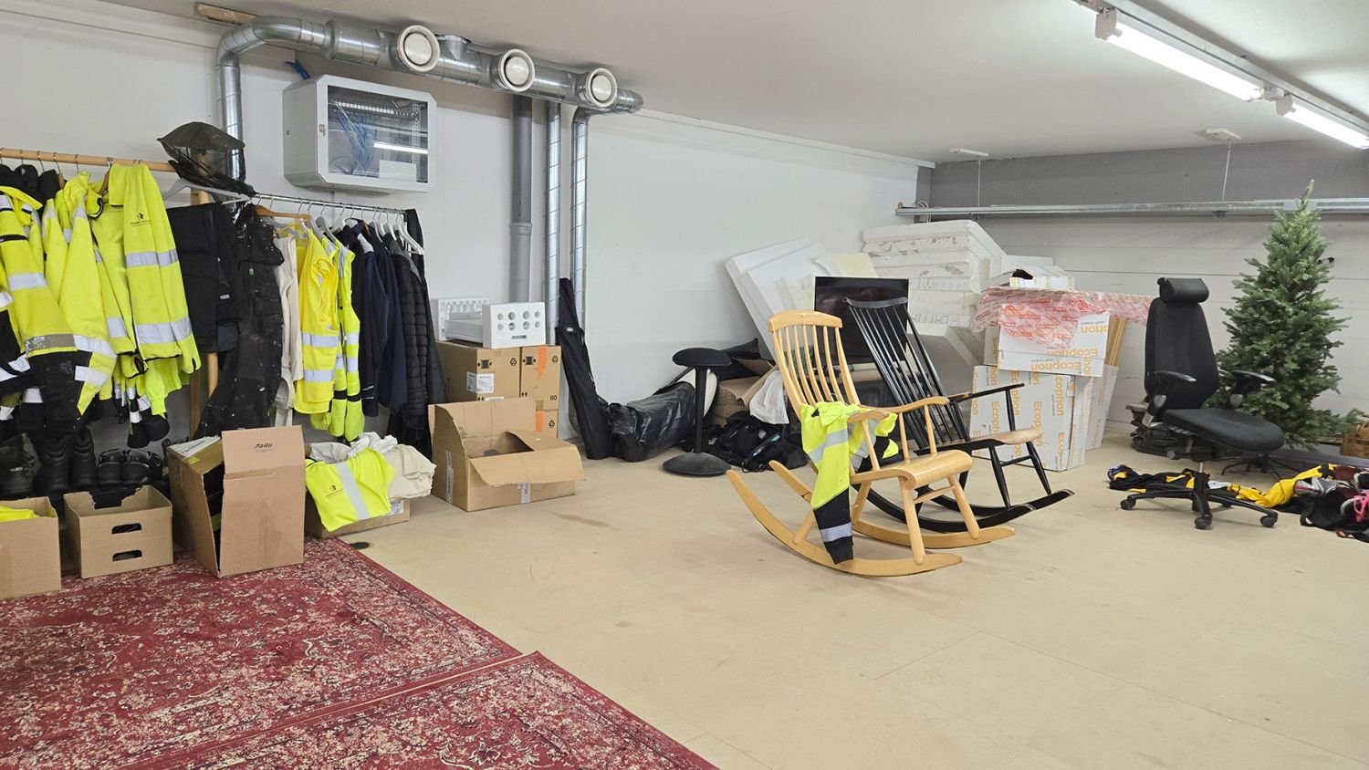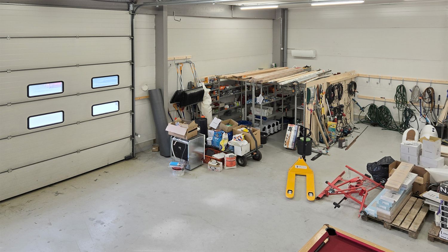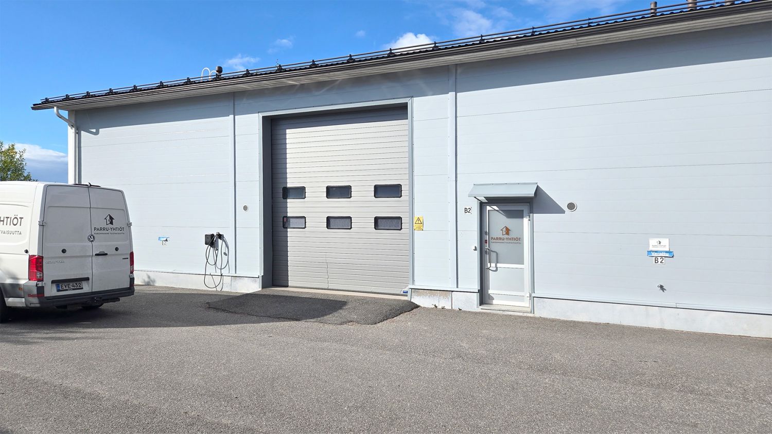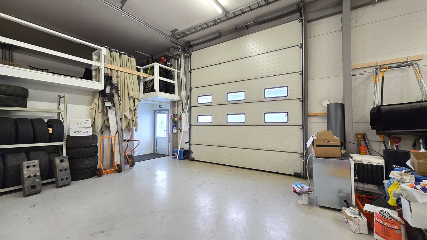 Hallin korkeus on noin 4,8 metriä. Hallitilan varusteluun kuuluu sähkökäyttöinen nosto-ovi (L 4 m x K 4,3 m), lattiakaivo ja vesipiste. Hallissa lämmitys ilmalämpöpumpulla. Koneellinen ilmanvaihto. Noin 90m² säilytysparvea toimiston päällä, missä myös lukittava arkistohuone.
