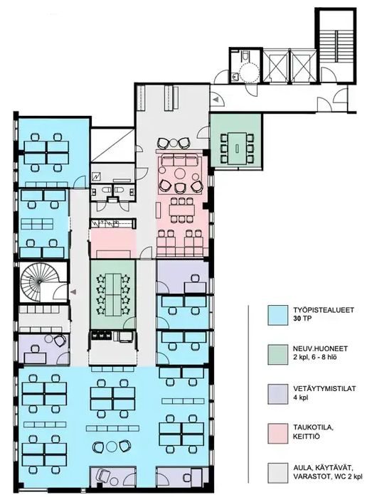 Tila koostuu useista erillisistä toimistohuoneista, neuvotteluhuoneista, keskittymistä vaativista tiloista, puhelinkopeista sekä vaaleasta ja käytännöllisestä keittiötilasta. Kokonaisuus on suunniteltu tukemaan tehokasta työskentelyä, ja tarvittaessa tilaa voidaan muokata yrityksen tarpeiden mukaan.
