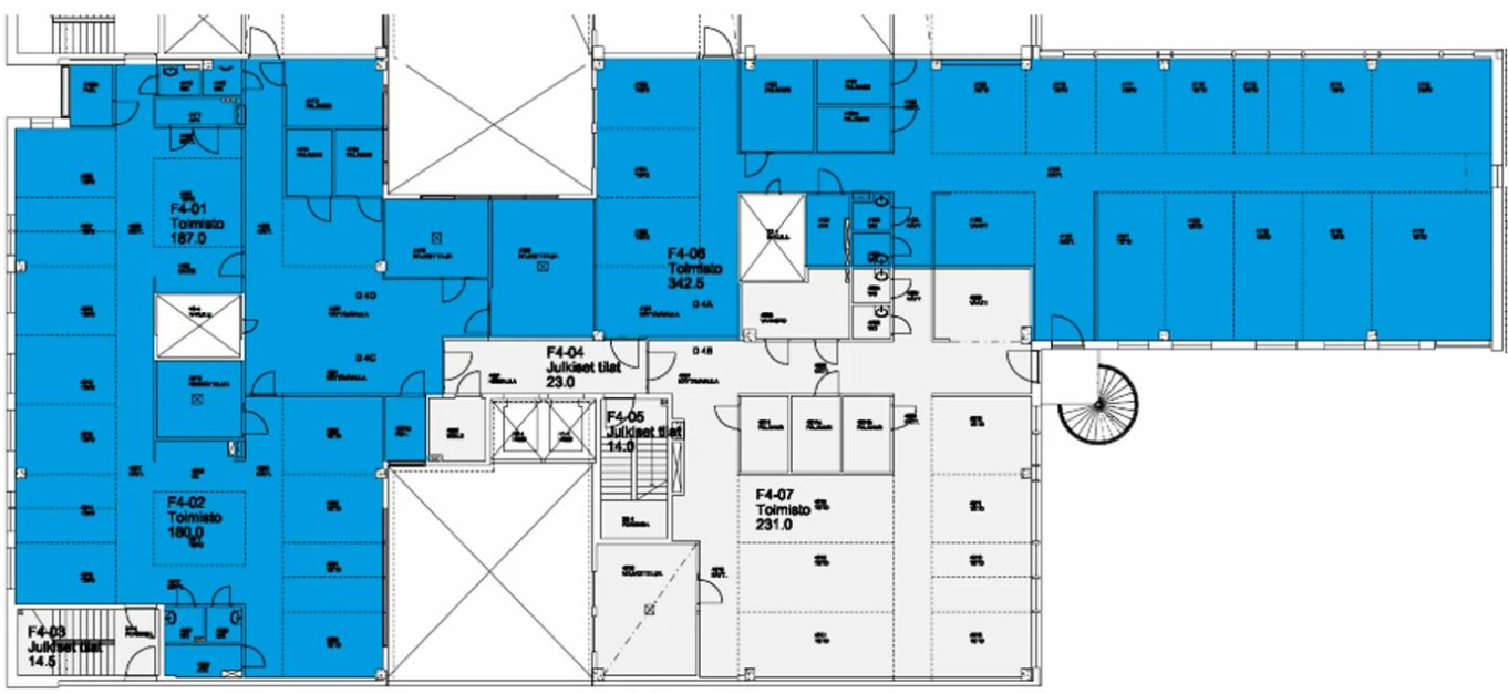 Tämä tila soveltuu erinomaisesti monitilatoimistoksi noin 55 henkilölle tai huonetoimistoksi noin 39 henkilölle. Henkilömäärät ovat suuntaa antavia arvioita ja riippuvat tilaratkaisusta.