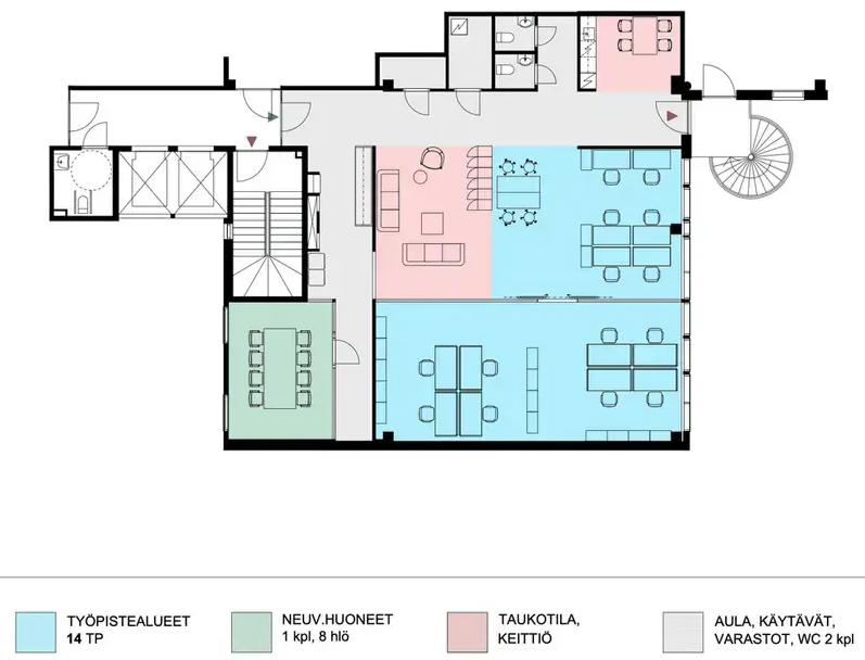 Tila soveltuu hyvin keskikokoiselle yritykselle, joka arvostaa selkeää pohjaratkaisua ja hyvää sijaintia. Tilassa on avotilaa ja lasiseinin rajattua työtilaa, jotka tukevat sekä tiimityötä että rauhallista keskittymistä. Lisäksi kokonaisuuteen kuuluu vaalea keittiö ja kaksi erillistä WC-tilaa, jotka lisäävät arjen mukavuutta. Sijainti kuudennessa kerroksessa takaa rauhallisen työympäristön.