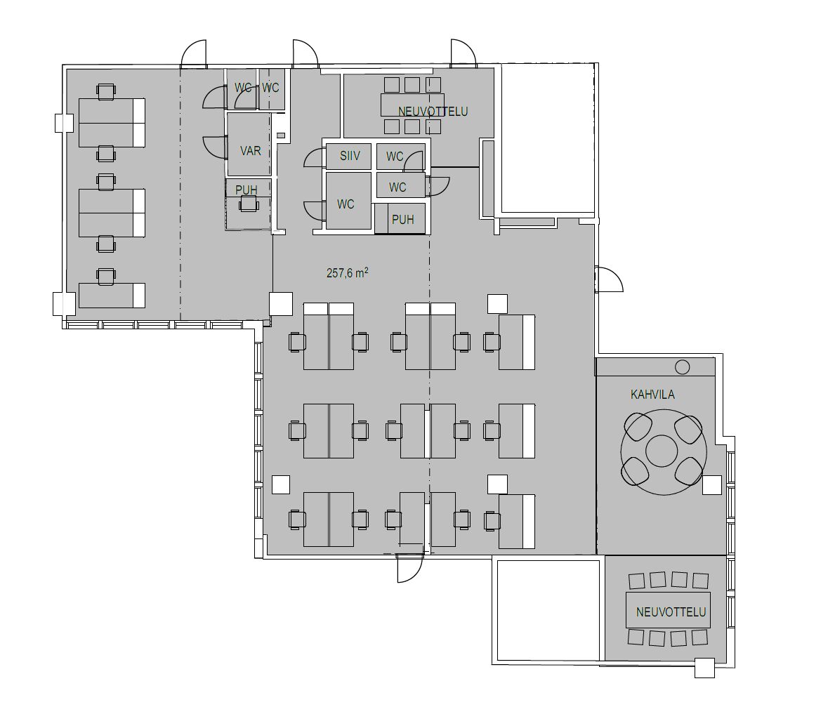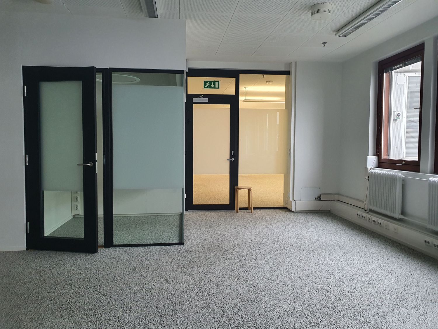 Tila on pääosin avonaista ja lisäksi siitä löytyy pari neuvottelutilaa, kaksi puhelutilaa, useita WC-tiloja ja reilun kokoinen taukokeittiö.