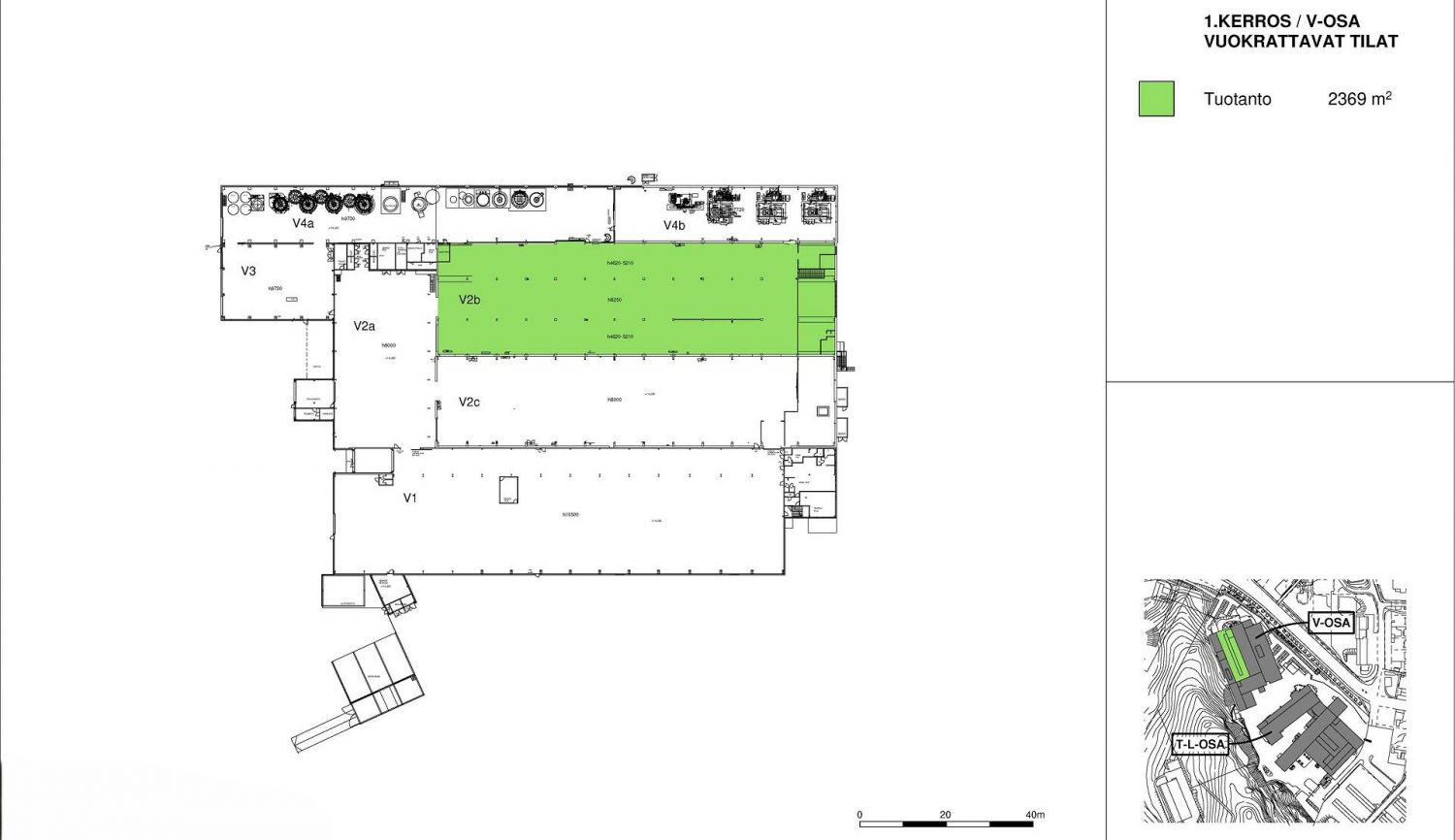 Varasto-/ tuotantotila (V2b), jonka läheisyydessä sisäyhteydellä on vuokrattavissa myös toimisto- ja sosiaalitilat henkilökunnan tarpeisiin.