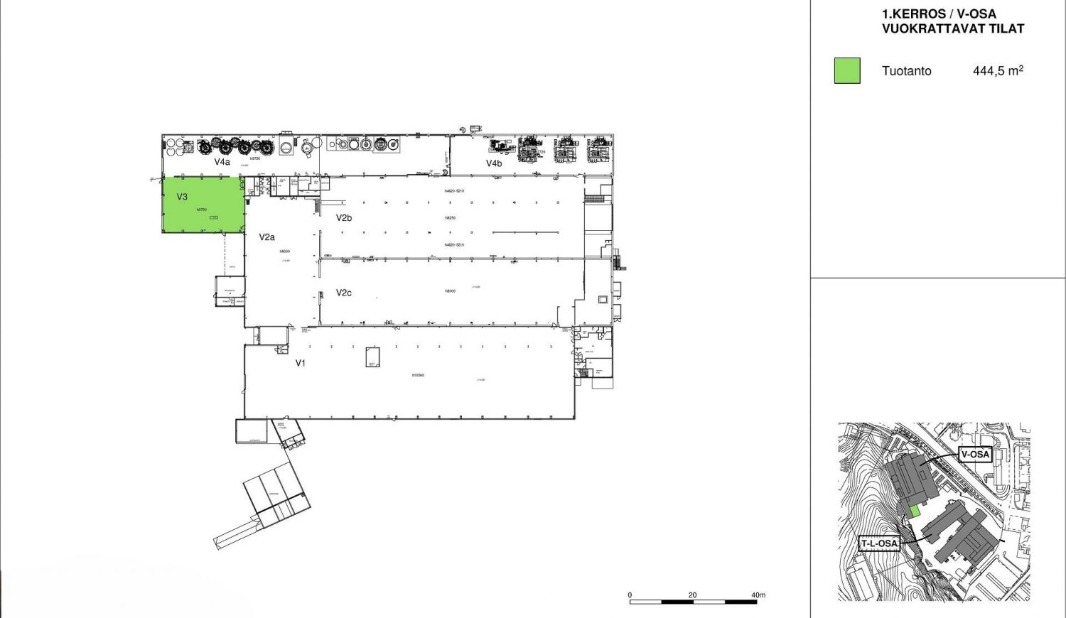 Tuotantotila (V3) johon valmiina maatason nosto-ovi. Tila on helppo yhdistää viereisiin tiloihin ja vuokrata laajempi tilakokonaisuus (tilat 2a-c) omat toimisto- ja sosiaalitilat huomioiden. Tilan maksimikorkeus on yli 9 metriä.