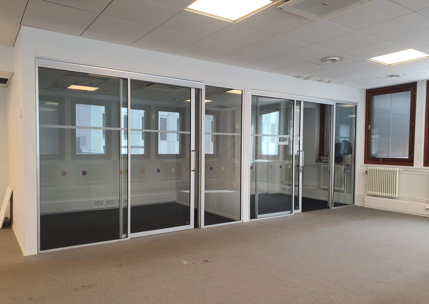 Tästä modernista ja valoisasta avotoimistotilasta löytyy myös reilun kokoinen neuvottelutila, pari toimistohuonetta lasiseinämillä.