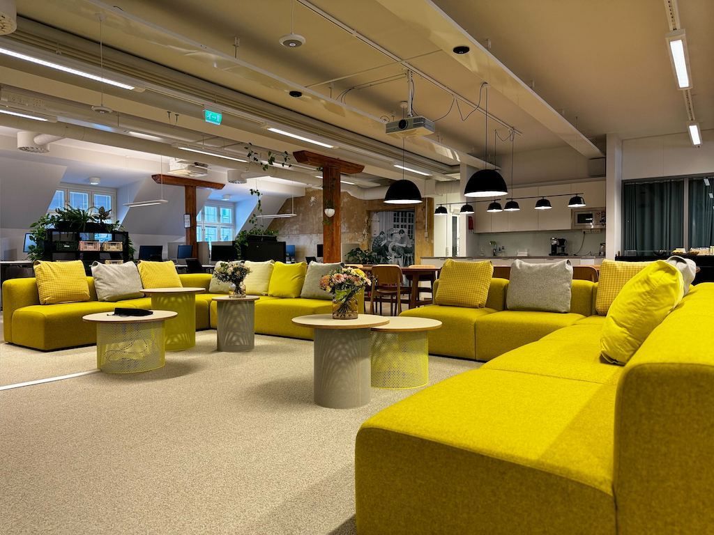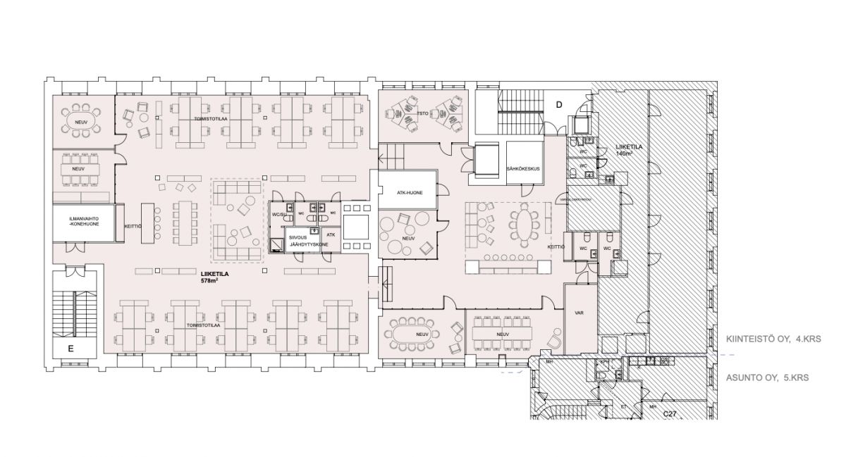 Tilassa on avotyöskentelytilaa ja useampi neuvottelu- / projektitila, avonainen keittiö ja loungetilat, suihku, sekä 4 wc:tä.