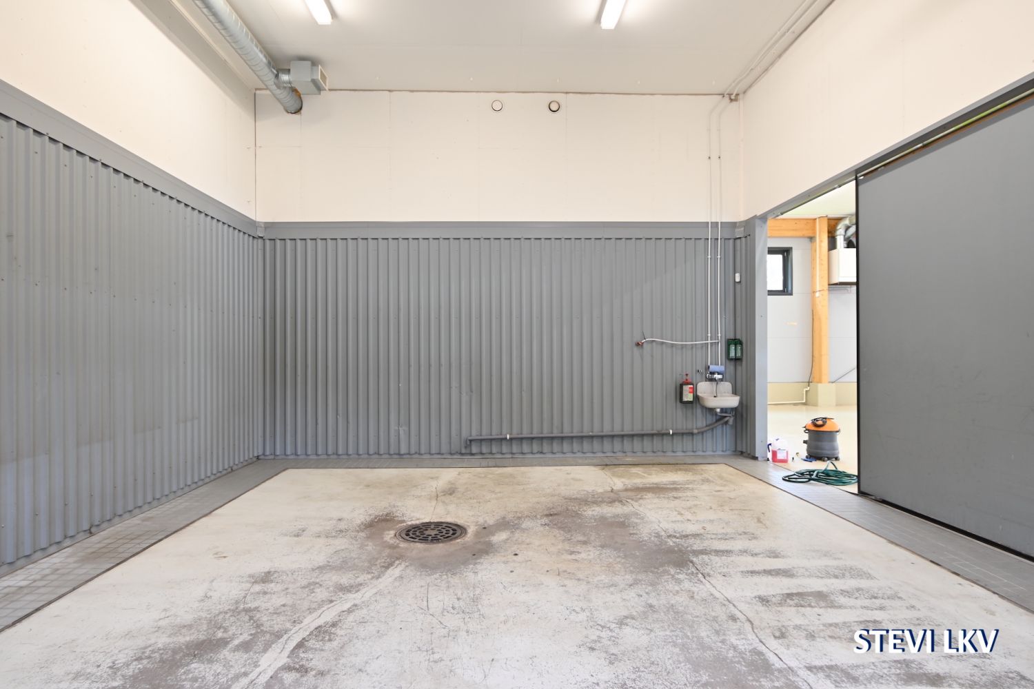 Toisessa päässä on pesupaikka lattiakaivolla (öljyn- ja hiekan erottimella).