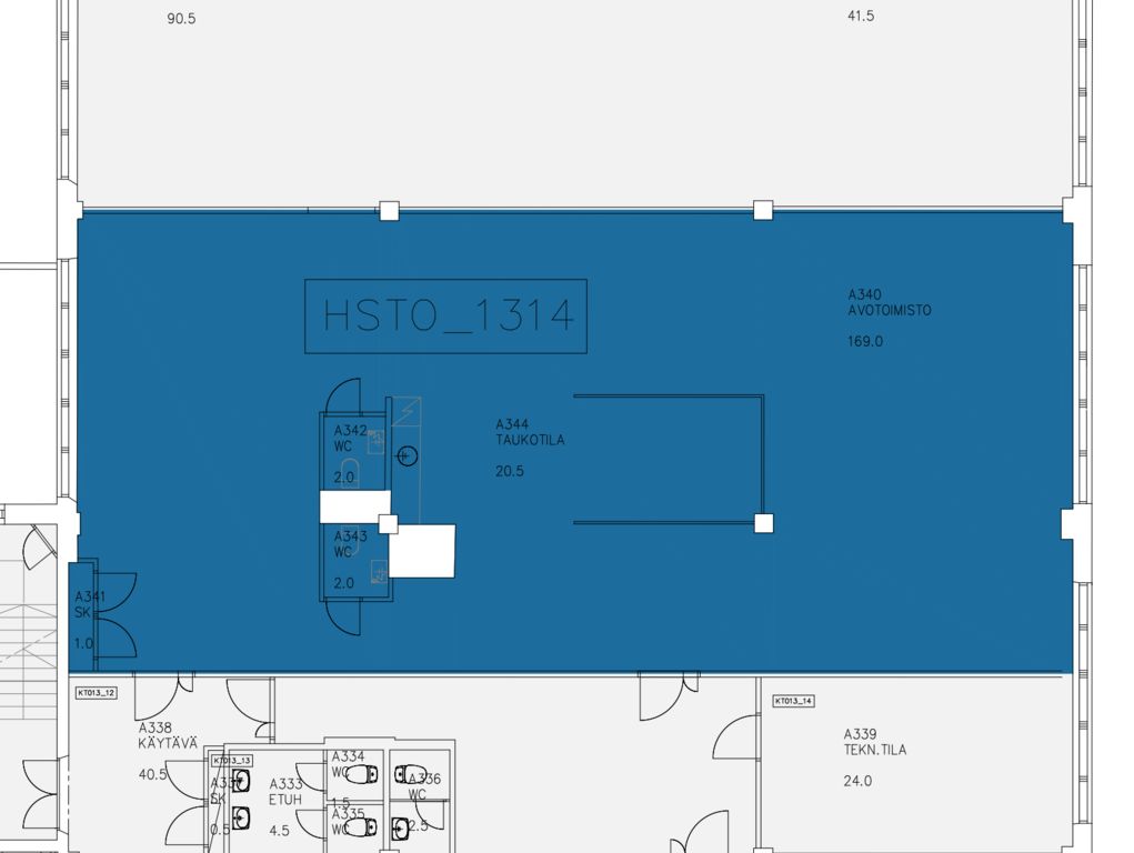 Tämä 198,5 m² toimisto sijaitsee kiinteistön B-portaan 3. kerroksessa. Tila koostuu kahdesta isosta huoneesta. Tila on avonainen, ja siihen kuuluvat omat keittiö- ja wc-tilat.