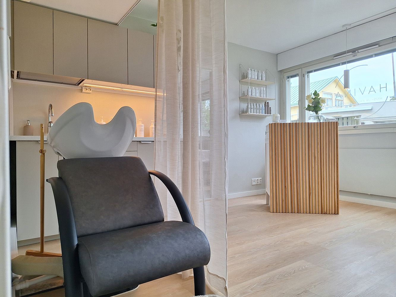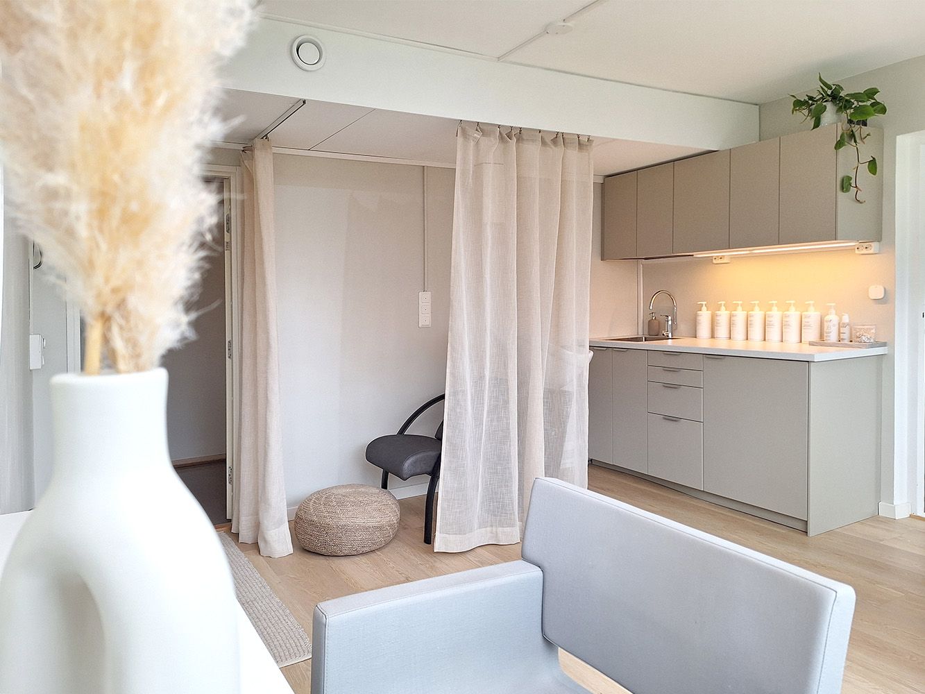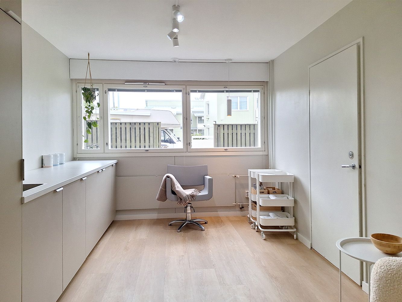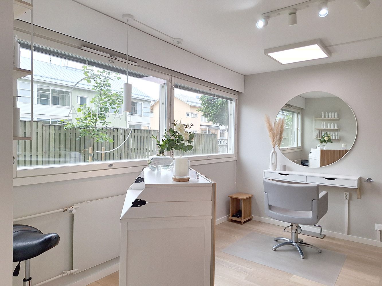 Tila on toiminut kampaamona ja soveltuu erinomaisesti esimerkiksi kampaajalle ja kosmetologille vaikka yhteiseksi toimitilaksi tai se on muunneltavissa moneen käyttötarkoitukseen. Tiloissa on 2 erillistä huonetta joissa molemmissa on hyvän kokoiset ikkunat, omat vesipisteet sekä sisäänkäynnit tarpeen vaatiessa. Lisäksi tilan hyvään varusteluun kuuluu integroitu jääkaappi/pakastin ja integroitu pyykinpesukone.