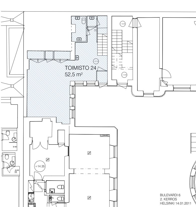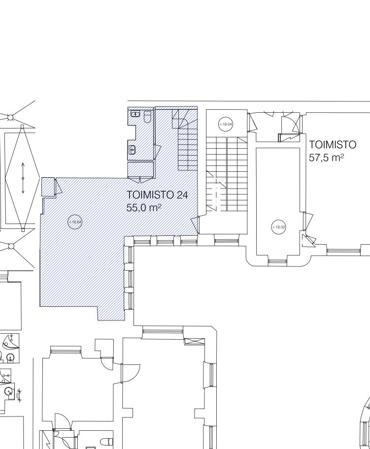 Suojaisella ja saneeratulla sisäpihalla sijaitseva, ja suoraan pihatasosta omalla sisäänkäynnillä varustettu kaksi kerroksinen noin 107,5 m2 toimitila. Molemmat kerrokset ovat noin samansuuruiset ja ne on yhdistetty portailla. Tiloissa on 2 avotilaa, 2 wc:tä, varasto ja keittiö. Tilassa on lämmöntalteenotolla varustettu koneellinen ilmanvaihto sekä erillinen jäähdytyslaitteisto.