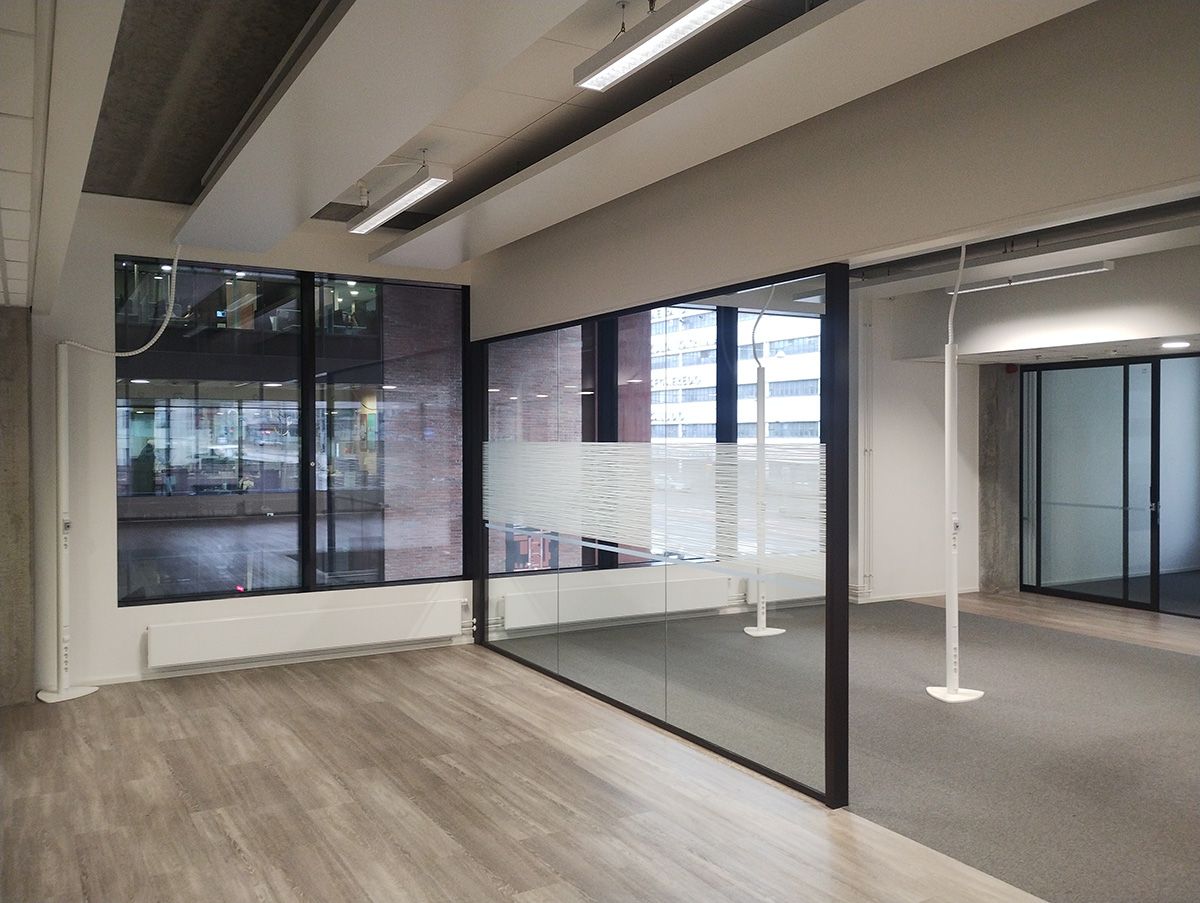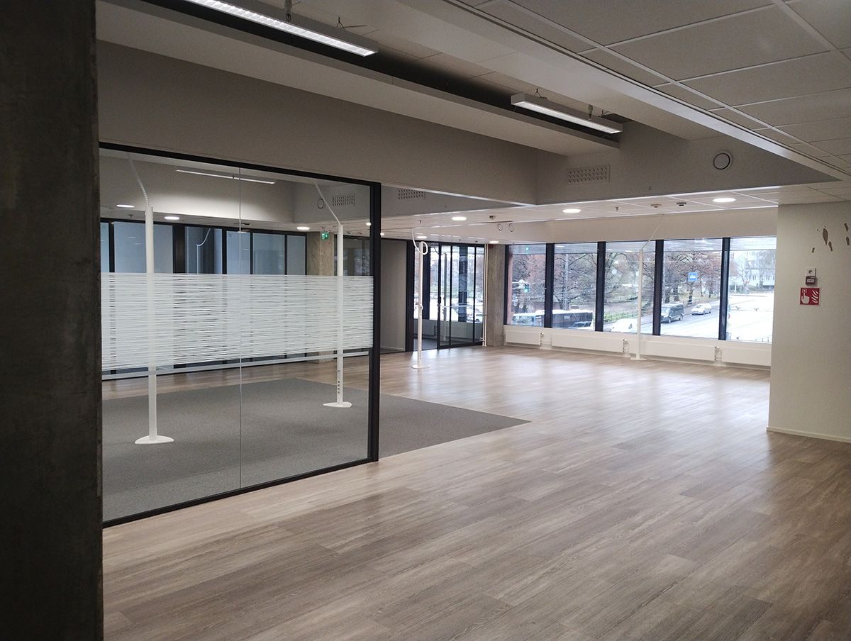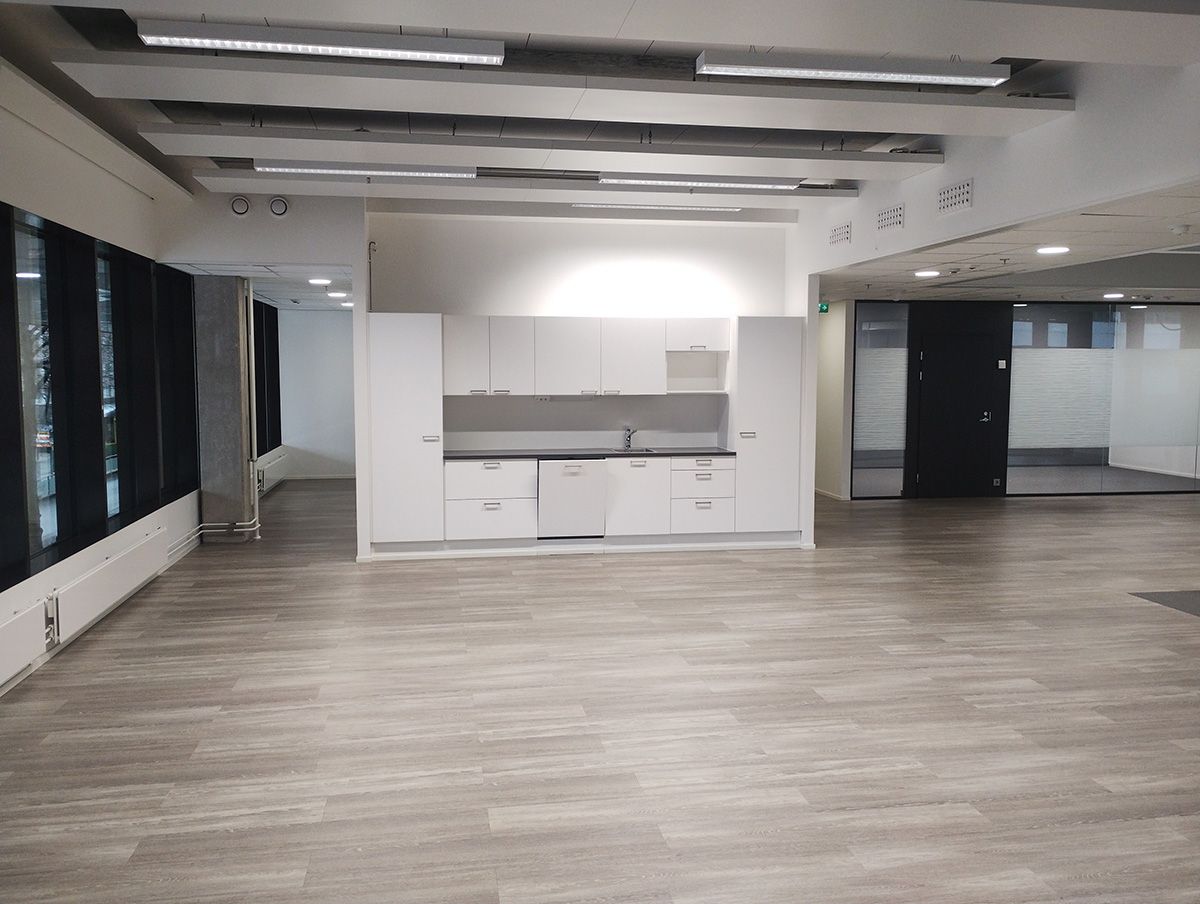 Vapaa ja valoisa toisen kerroksen toimitila tarjoaa avaran avotilan, useita erillisiä työhuoneita sekä hyvin varustellun keittiön ja wc-tilat.