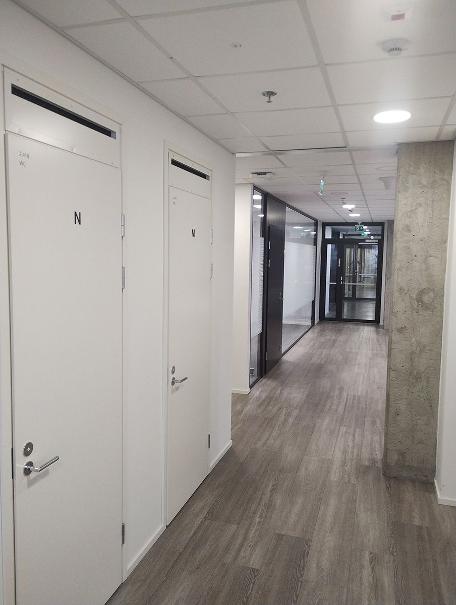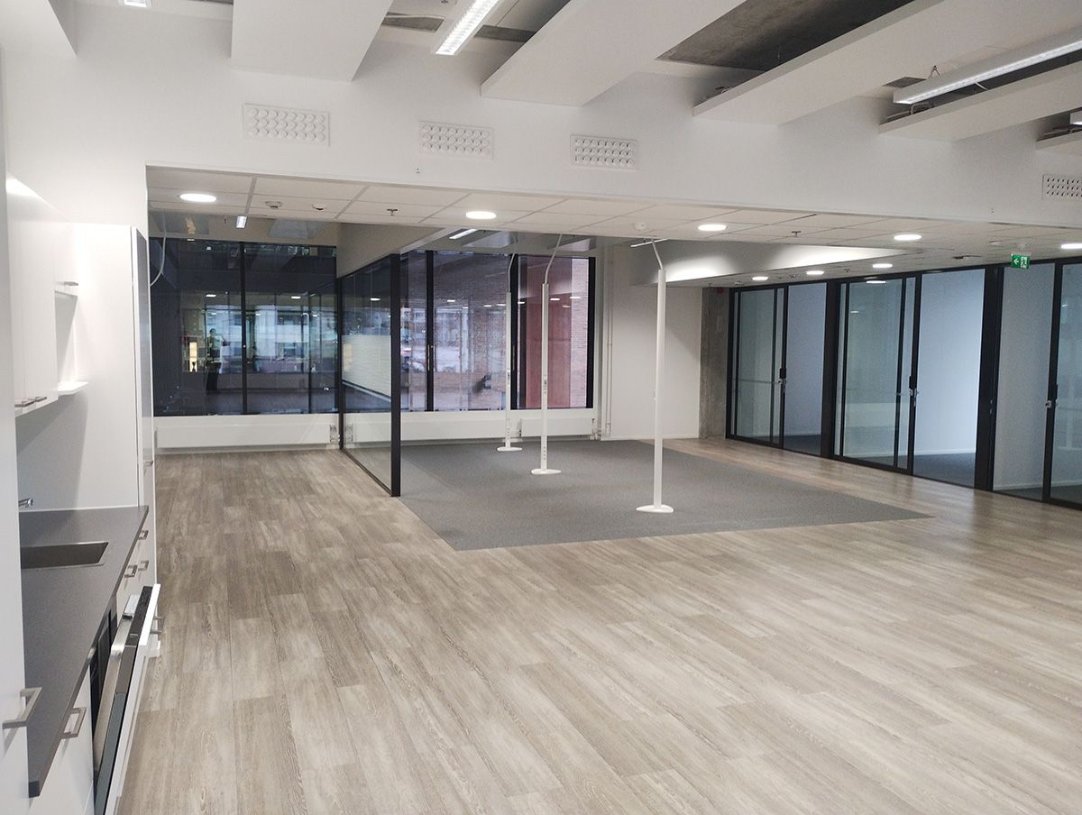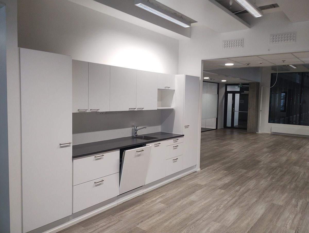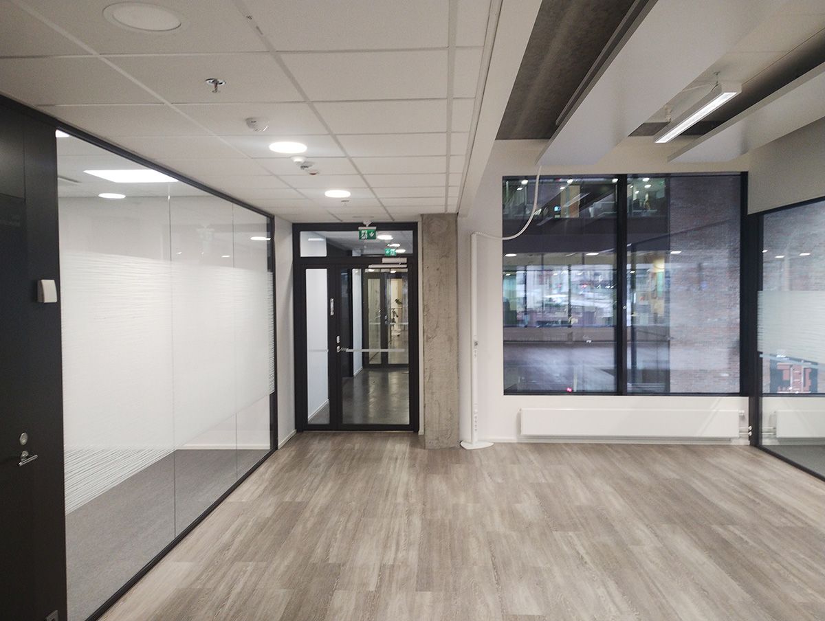 Vapaa ja valoisa toisen kerroksen toimitila tarjoaa avaran avotilan, useita erillisiä työhuoneita sekä hyvin varustellun keittiön ja wc-tilat.