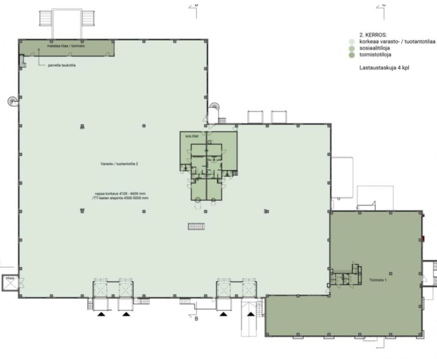 Koskelossa riittävästi varasto-tuotanto-toimistotilaa. Ensimmäisen ja toisen kerroksen vapaa korkeus noin 4,5 metriä. Lattiakantavuus 2000 kg/m2. 3 kpl maantason nosto-ovi, 1 kpl lastauramppi nosto-ovella ja 7 kpl lastaustaskuja. Varastotuotantotilaa 7100 m2 ja toimistotilaa 790 m2 .Lisäksi sosiaali - ja ravintolatilat. Piha-alueella noin 140 parkkipaikkaa.