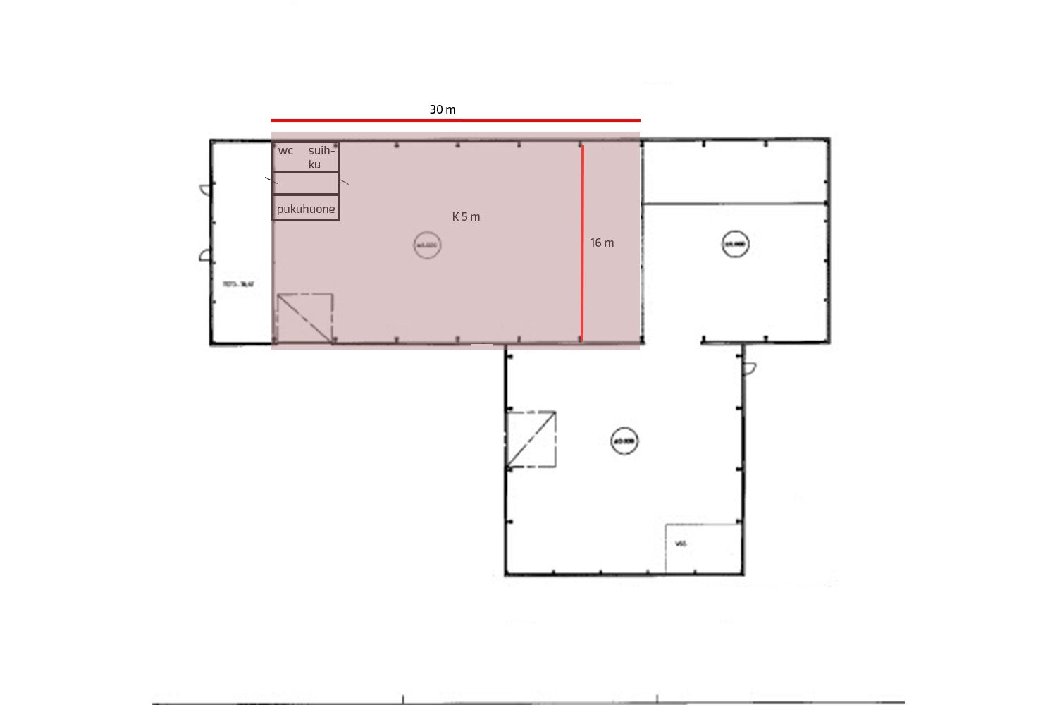 Kunto, varusteet ja palvelut: Hyväkuntoinen tila. Lattiakaivot, nosto-ovi, vesipiste, wc – ja suihkutilat sekä voimavirta