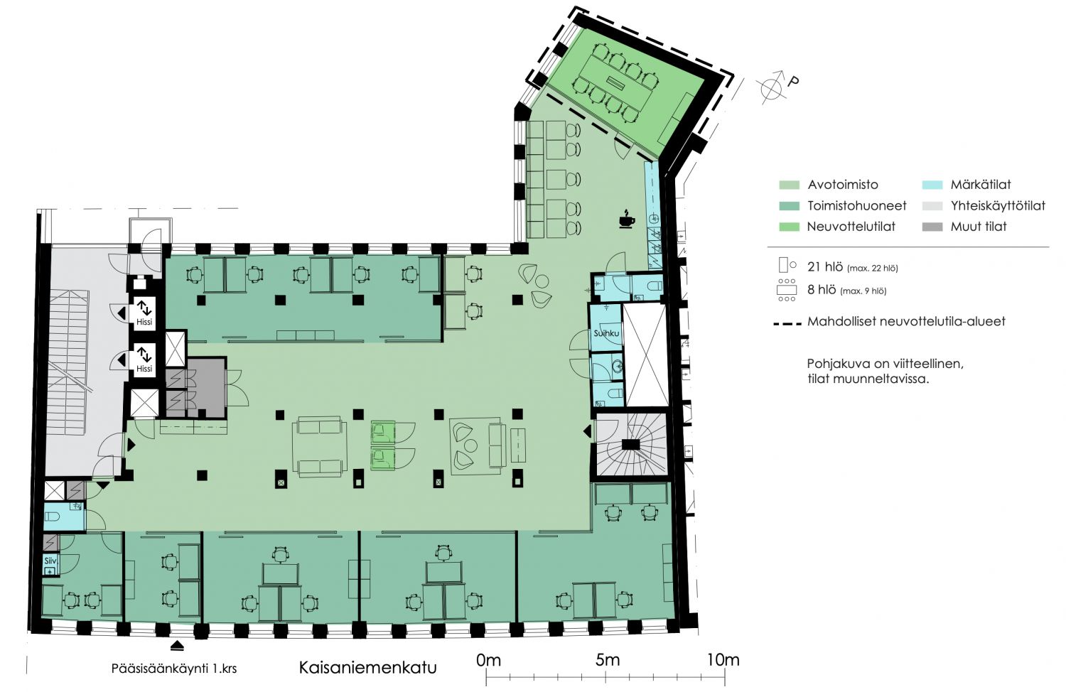 Siisti läpitalon toimisto, josta näkymät sekä Kaisaniemenkadulle että sisäpihalle. Tila on muuttovalmis ja siellä on sekä huoneita että avotilaa työskentelylle. Kiinteistössä on tehty putkiremontti vuoden 2025 aikana ja tämän yhteydessä uusittiin samalla kaikkien tilojen wc-pinnat sekä kalusteet.