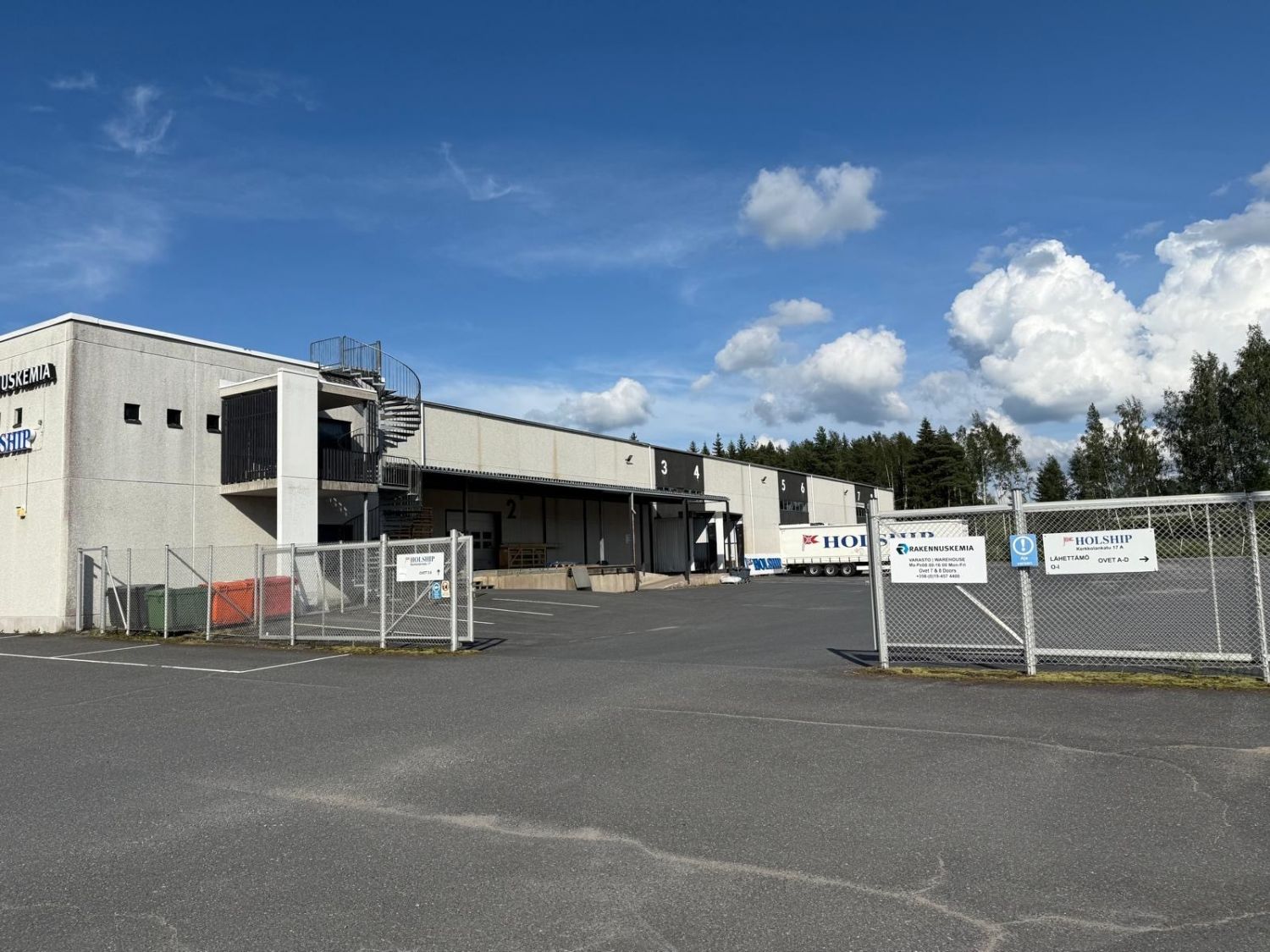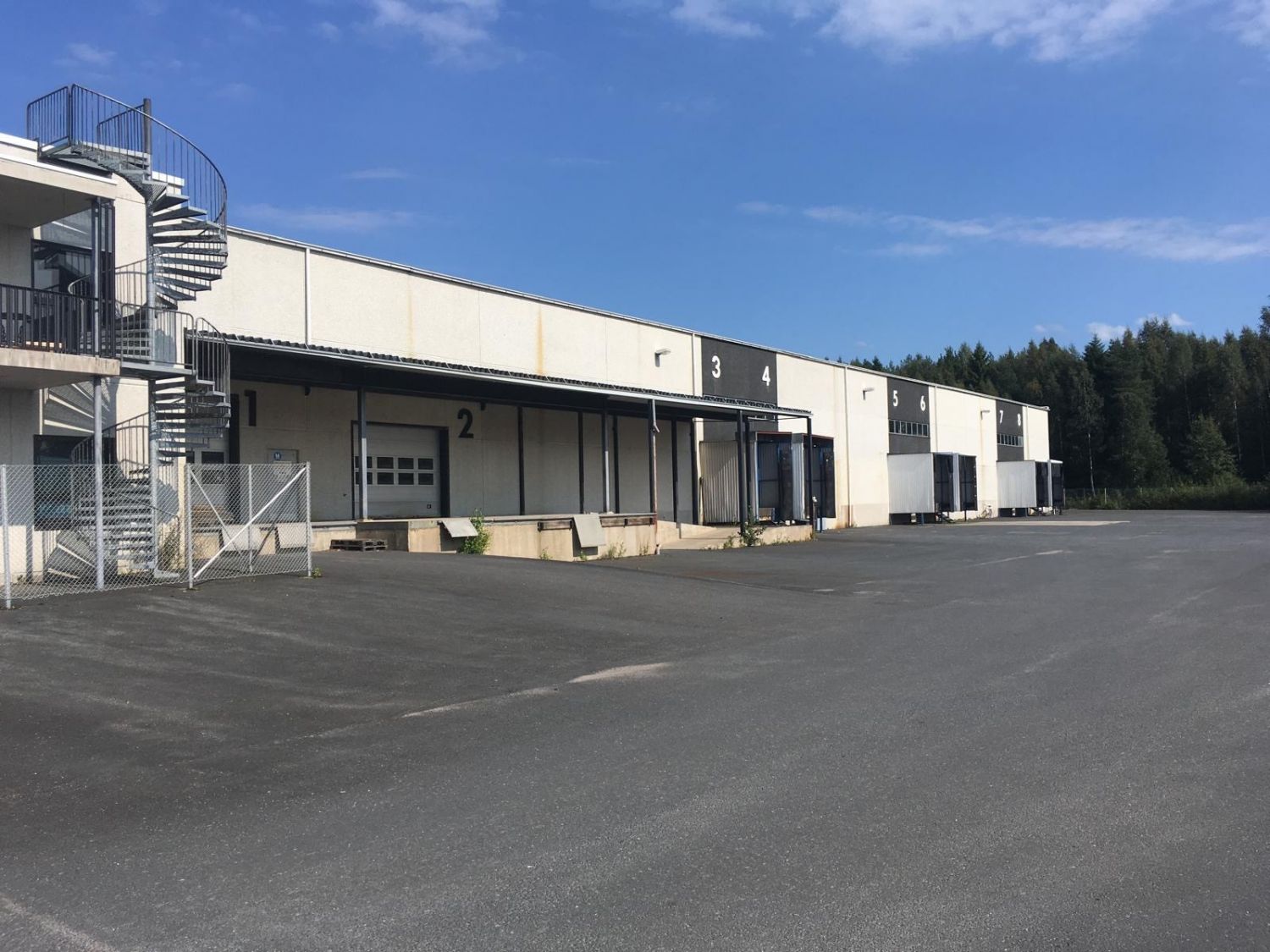 Varaston vapaa korkeus on n. 7 m. Hyvät katetut lastauslaiturit, jossa katon korkeus 440cm ja lisäksi lastaustaskuja. Pihatilaa on runsaasti myös yhdistelmäajoneuvoa ajatellen. Tarvittaessa saadaan tehtyä myös sisäänajoyhteys. Lastauspiha on aidattu ja lukittu. Tila voidaan tarvittaessa jakaa pienempiin osiin. Lattiaperustus on 20cm maanvarainen laatta, joten kantavuus on hyvä.