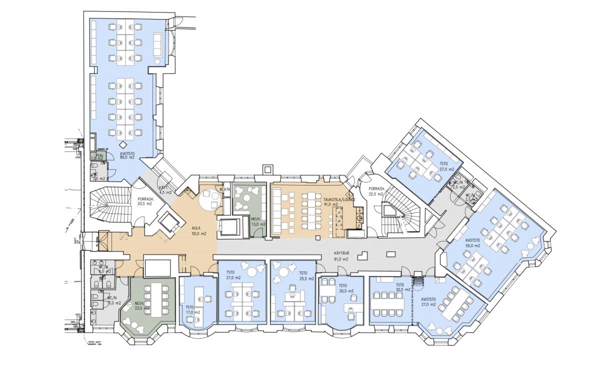 Vuokrataan hyväkuntoinen toimisto, joka kattaa kokonaisen oman kerroksen. Toimisto sisältää useita eri kokoisia huoneita, joten tila on helppo jakaa erilaisiin käyttötarkoituksiin. Toimiston maisemat avautuvat Lapinlahden puistikkoon. Tila mahdollista remontoida seuraavan vuokralaisen tarpeiden mukaan.