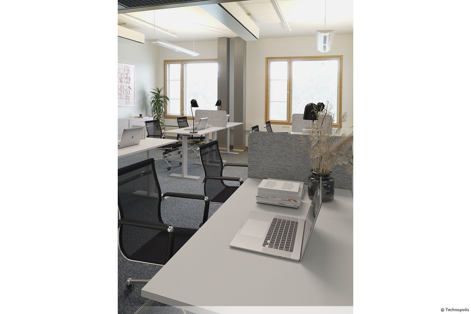 Tila on mahdollista vuokrata myös kalustettuna. Saatavilla ovat lisäksi työtilan suunnittelu- ja muuttopalvelut. Ota yhteyttä ja tule tutustumaan paikan päälle.