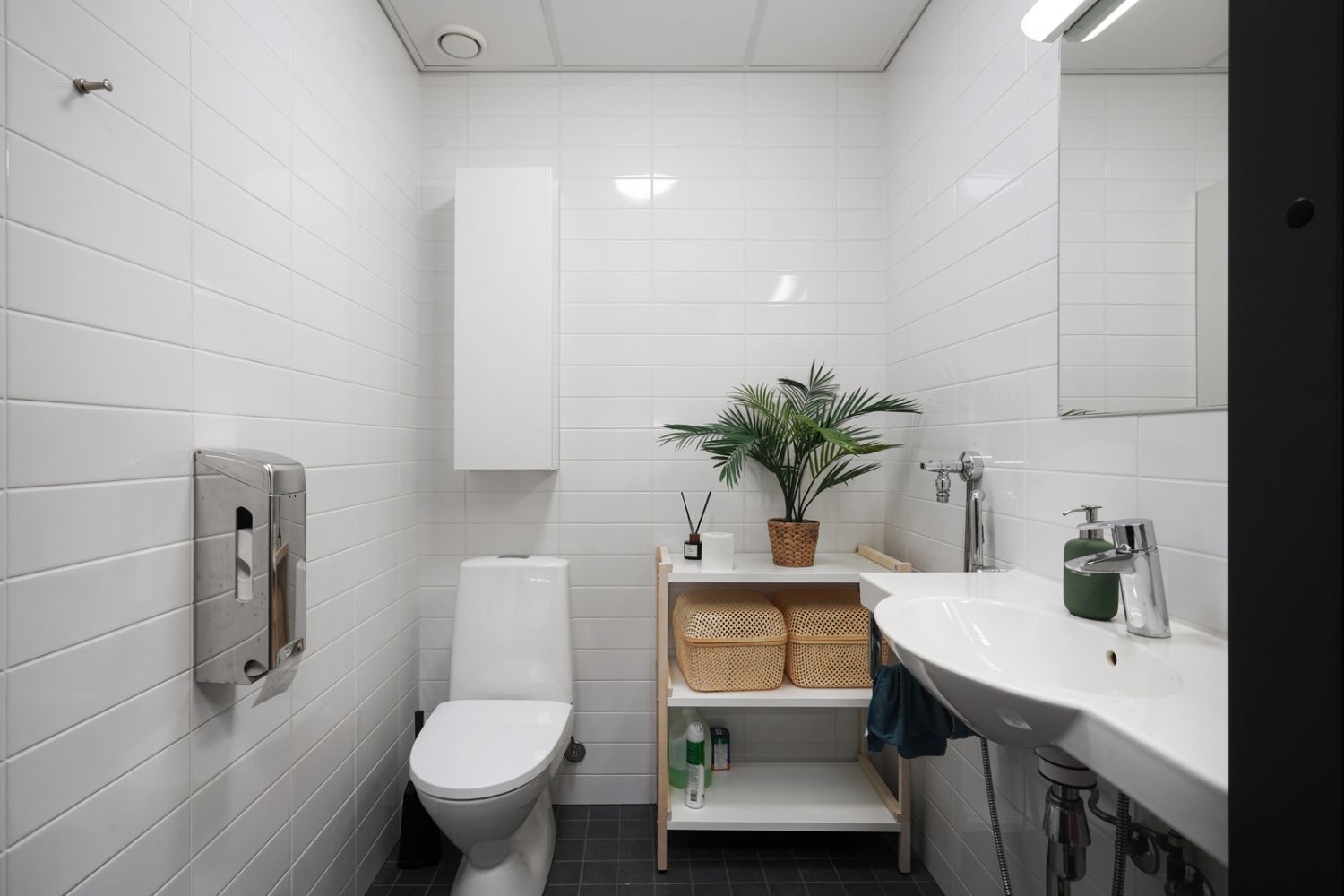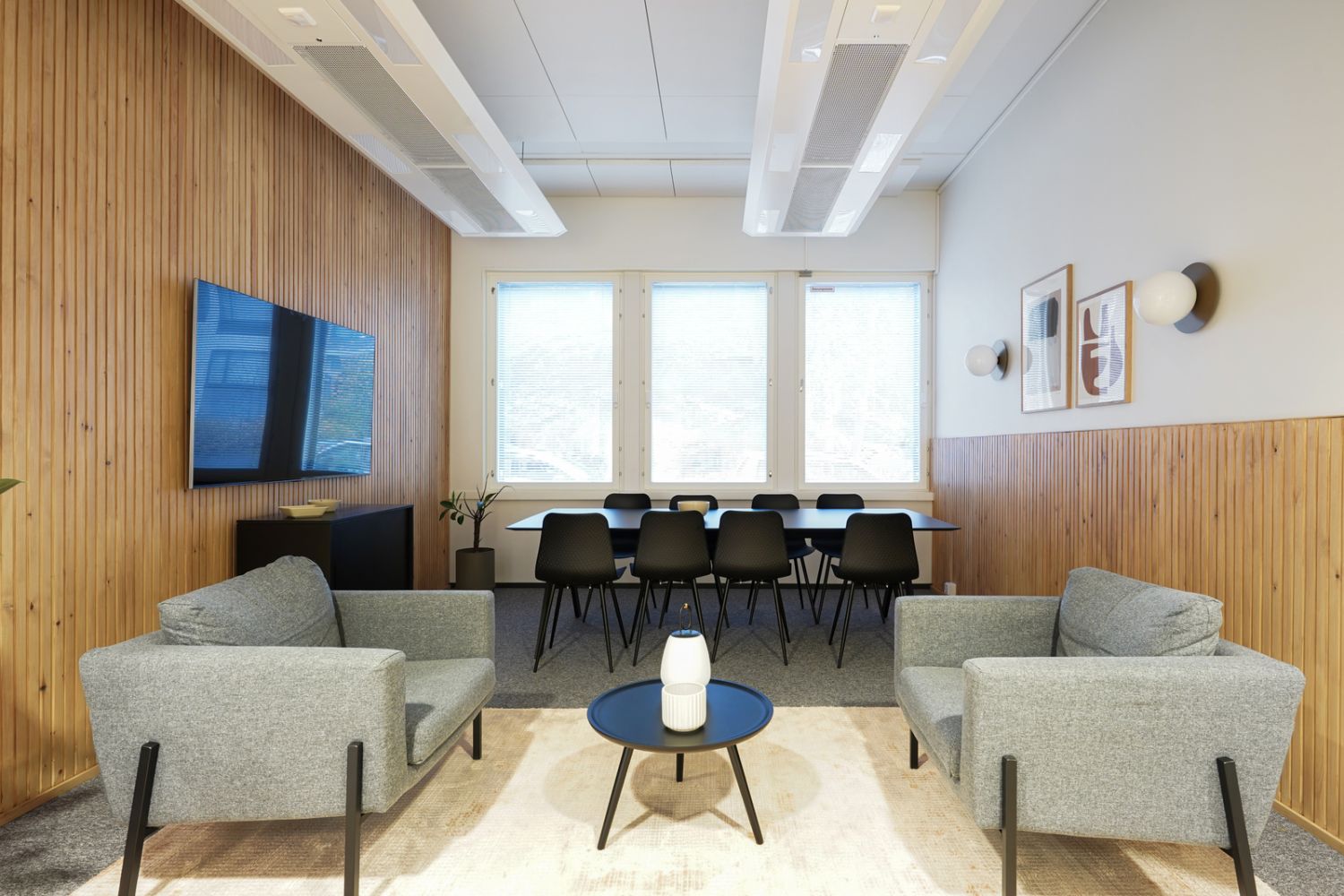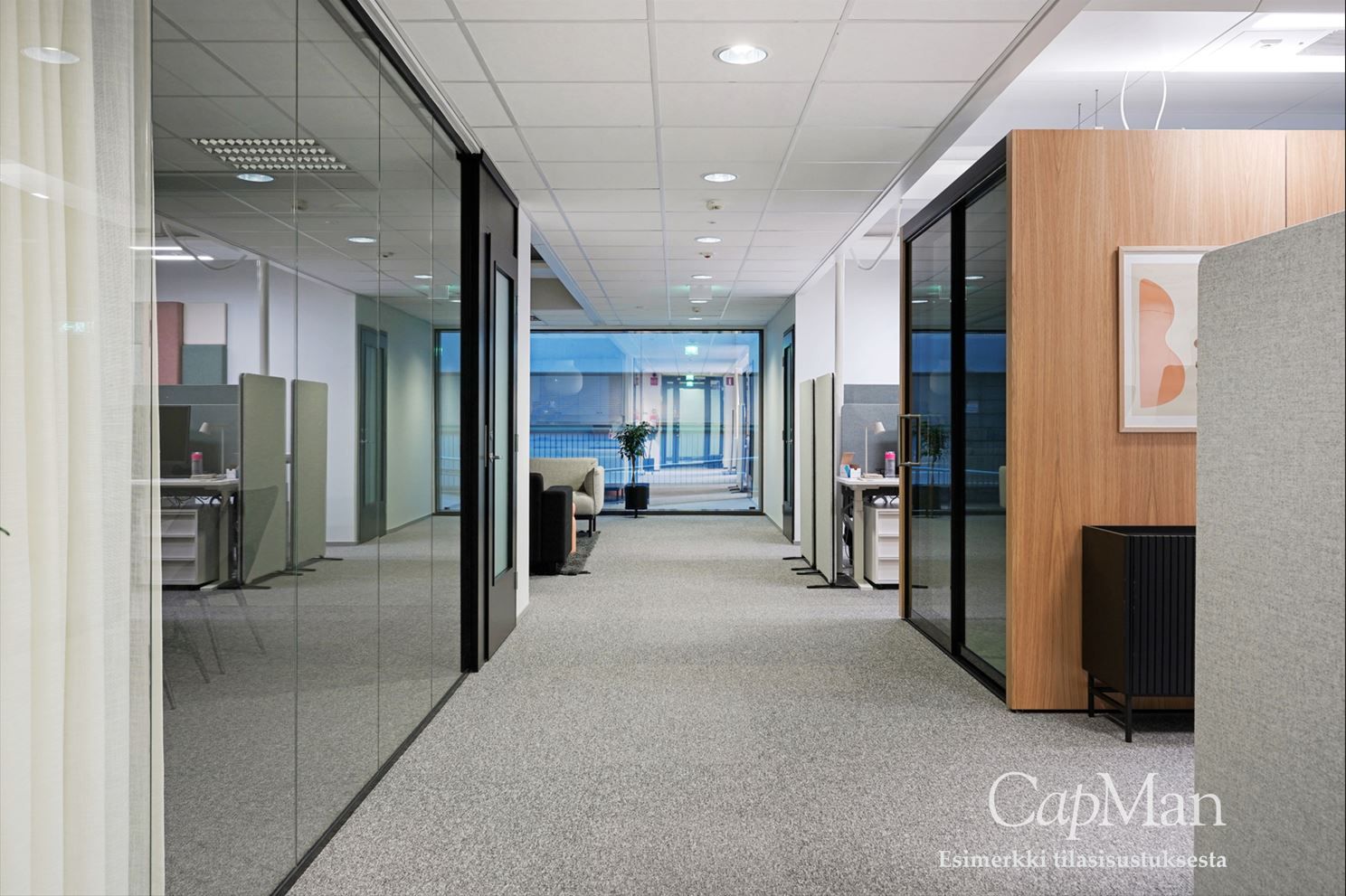 Hyväkuntoinen toimisto, johon sisäänkäynti suoraan aulasta. Työhuoneita, neuvotteluhuone ja tiimihuone sekä aulalounge. Kaksi vessaa ja pieni keittiö. Vuokrattaviin neilöihin lisätään osuus yhteiskäyttöisistä tiloista. Ohessa havainnollistavia kuvia.