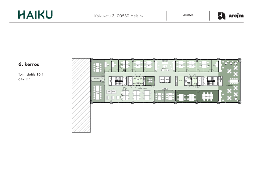 HAIKUN tiloja voidaan jakaa täsmälleen sopivan kokoisiksi 1–4 vuokralaiselle. HAIKUN vuokrattavat tilat kerroksittain ovat pinta-alaltaan alkaen n. 150 m2 ja koko kerroksen kattavat tilat, n. 650 m2. Myös eri kerroksissa sijaitsevien tilojen joustava yhdistely onnistuu. Täydellisen peruskorjauksen ansiosta HAIKU-talon vuokralaiset saavat käyttöönsä laatutasoltaan täysin uutta vastaavat toimitilat. Uudistuksen yhteydessä rakennettiin myös sisäänkäyntilaajennus ja puistomainen sisäpiha.