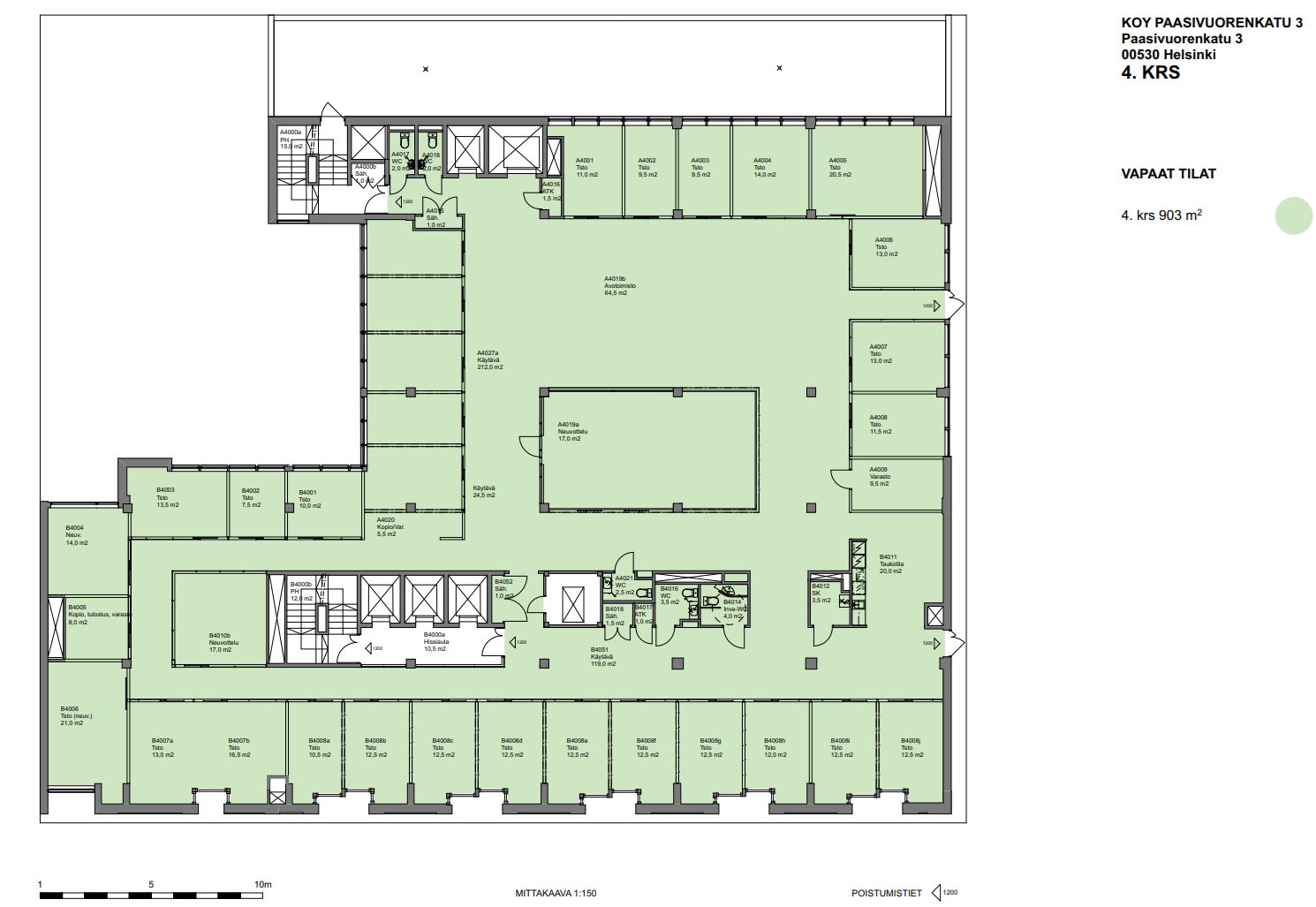Paasivuorenkadun neljännessä kerroksessa sijaitseva 902 m² toimisto tarjoaa yritykselle joustavat ja toimivat tilat. Pohjaratkaisu yhdistää avaraa avotilaa, erikokoisia työ- ja neuvotteluhuoneita sekä toimivat tukitilat. Tiloista löytyy keittiö ja taukotila, useita wc-tiloja sekä erillinen suihkullinen sosiaalitila. Suuret ikkunapinnat tuovat runsaasti luonnonvaloa ja näkymät avautuvat kauniisti Paasivuorenpuistikkoon, mikä tekee työympäristöstä miellyttävän ja inspiroivan.
