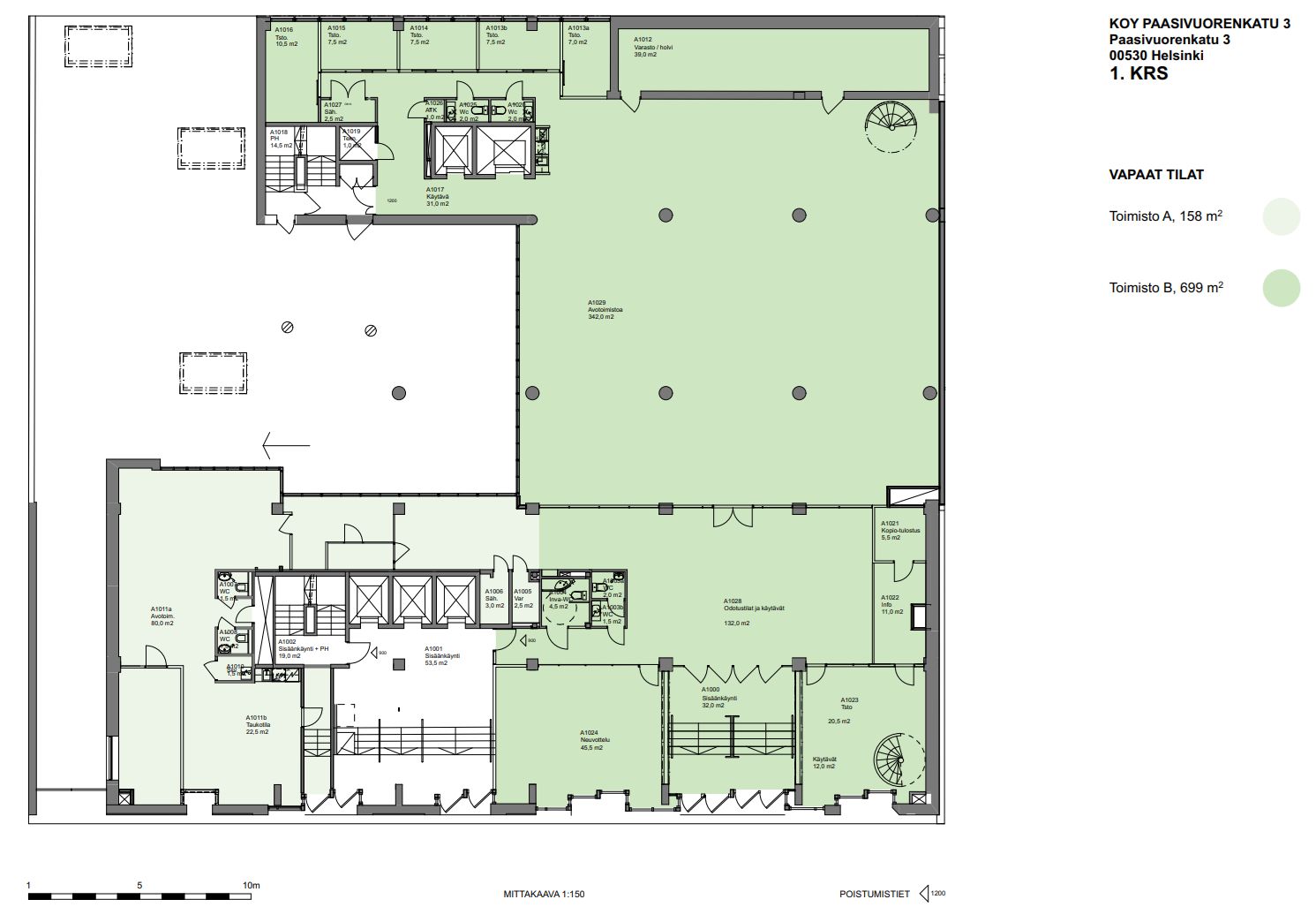 Paasivuorenkadun ensimmäisessä kerroksessa sijaitseva 815,5 m² kokoinen toimitila tarjoaa yritykselle ainutlaatuiset ja edustavat puitteet. Tilaa hallitsee vanha pankkisali, jonka korkea huonekorkeus ja avara pohjaratkaisu tekevät siitä näyttävän ja monikäyttöisen kokonaisuuden. Kuvista poiketen tilan alkuperäinen marmorilattia on otettu osittain uudelleen esille, mikä korostaa rakennuksen arvokasta historiaa ja antaa tilalle erityisluonteen.