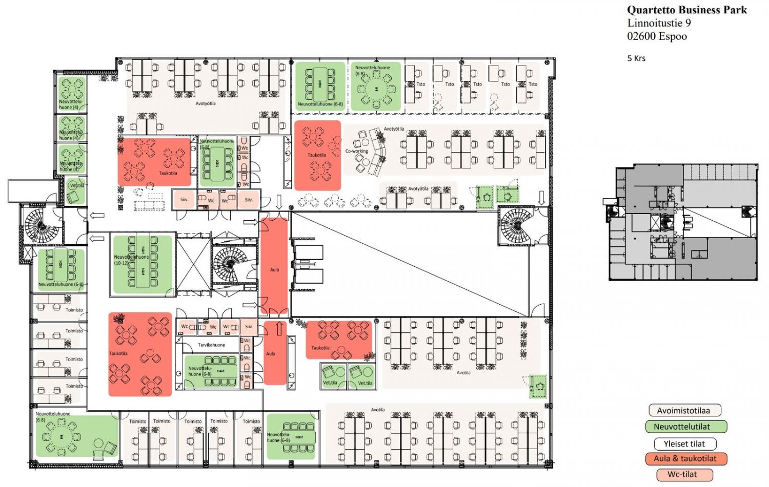 Tilat ovat valoisia ja tehokkaasti suunniteltuja, ja kiinteistössä on kaikki tarvittavat palvelut sujuvaan arkeen. Läheltä löytyvät myös monipuoliset palvelut ja lounasvaihtoehdot, jotka tukevat työpäivän sujuvuutta.