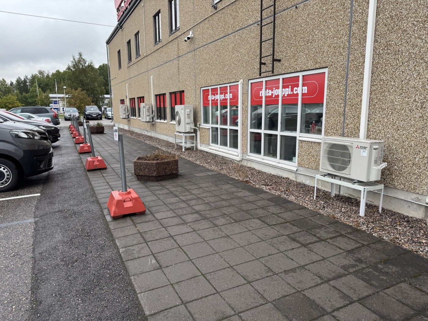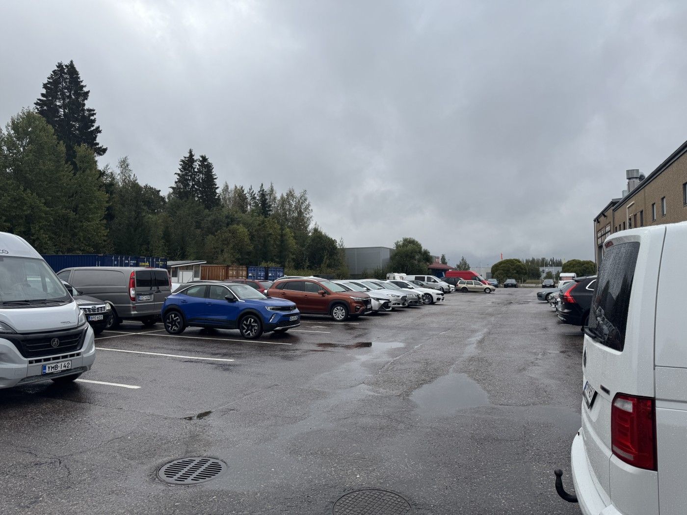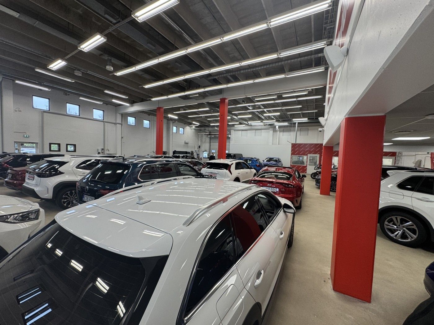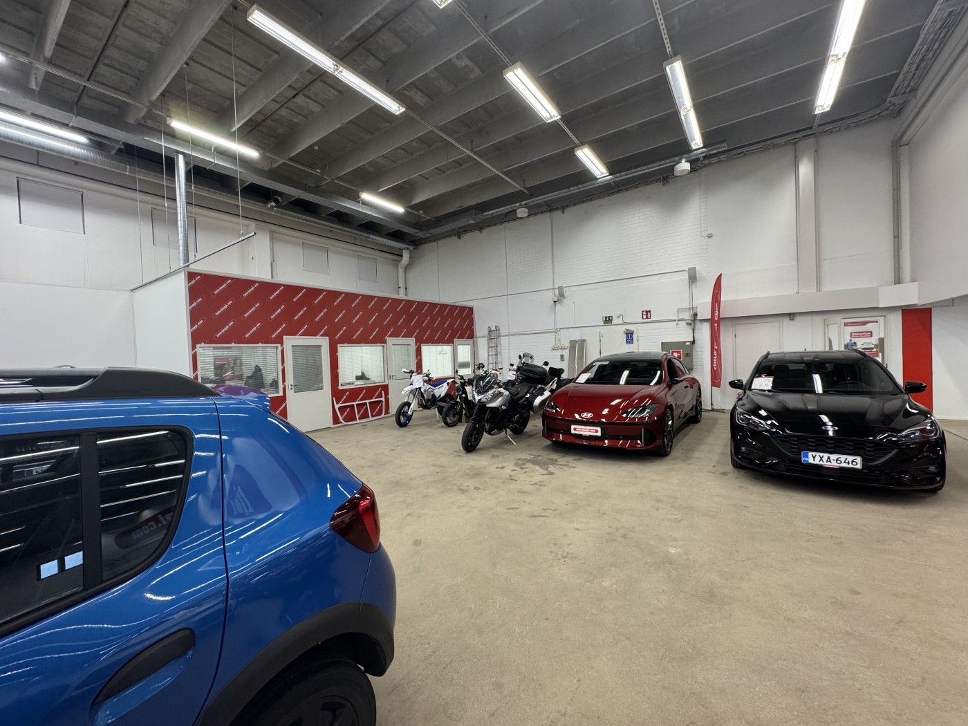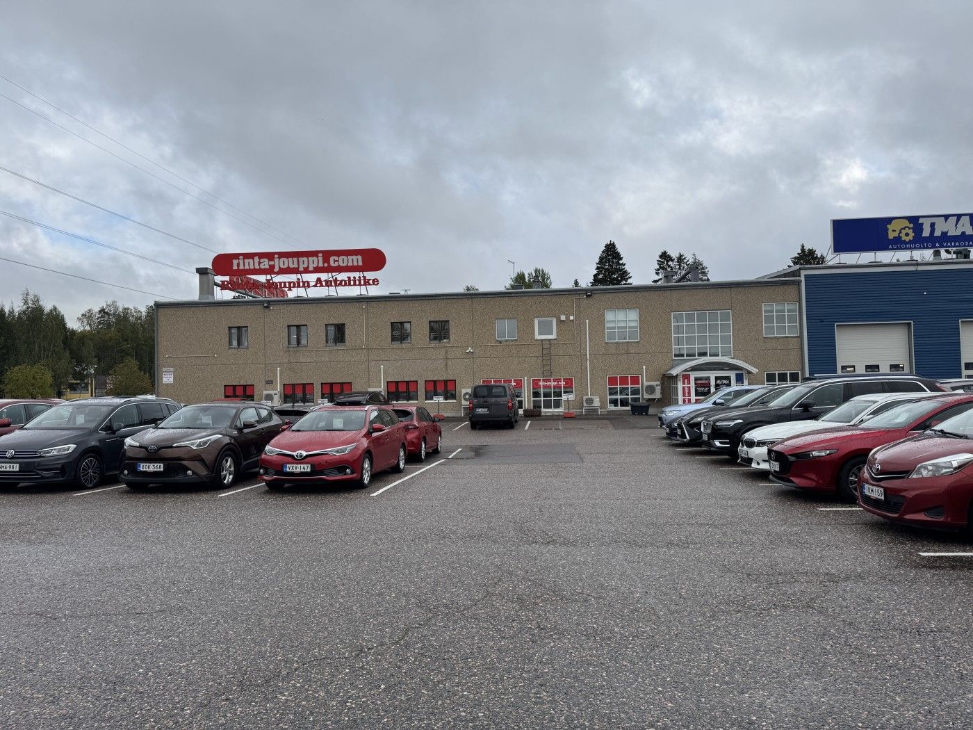 Siisti, korkea halli jolla hyvin pysäköintitilaa pihalla eri puolilla rakennusta. Tiloissa toimii autokauppa.