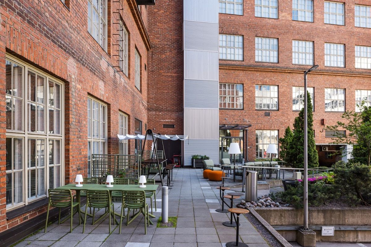 Olohuonemaisten tilojen lisäksi varjoinen sisäpiha houkuttelee työskentelemään ja kahvittelemaan toimistotilojen ulkopuolellakin.