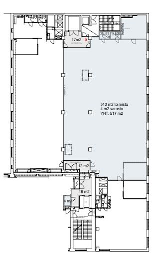 Rouhea korkea tila. Parhaimmillaan avotilana, showroomina jne. Tilaan tulee tavarahissi.