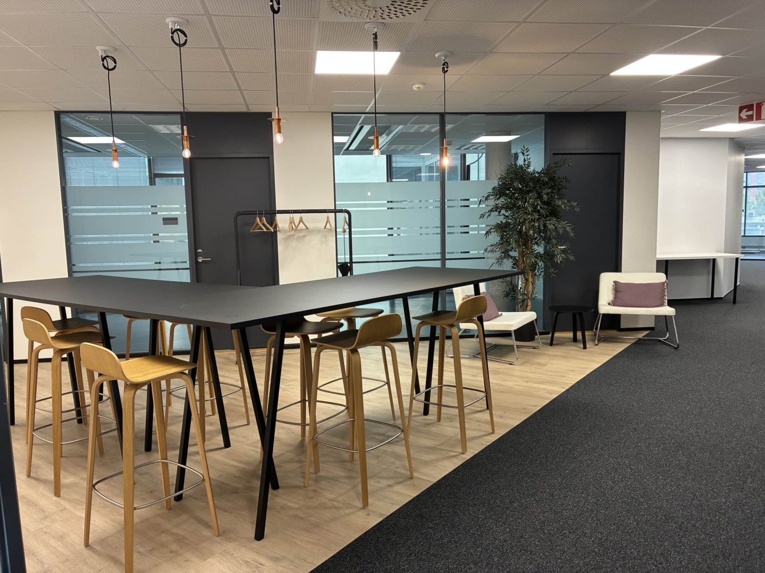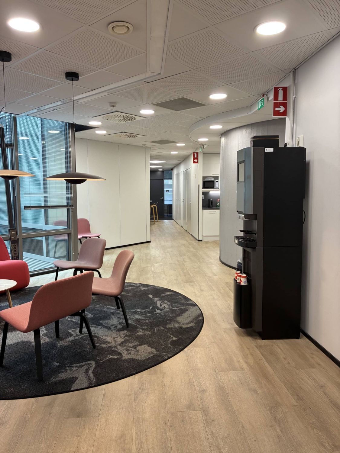 Erikokoisia huoneita, isot aula- ja oleskelutilat, muutama erikokoinen neukkari, keittiöseinäke (kahviautomaatti) ja wc-tilat.