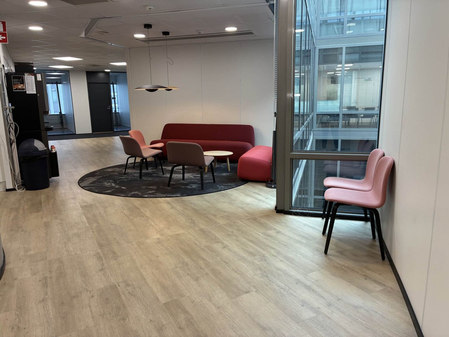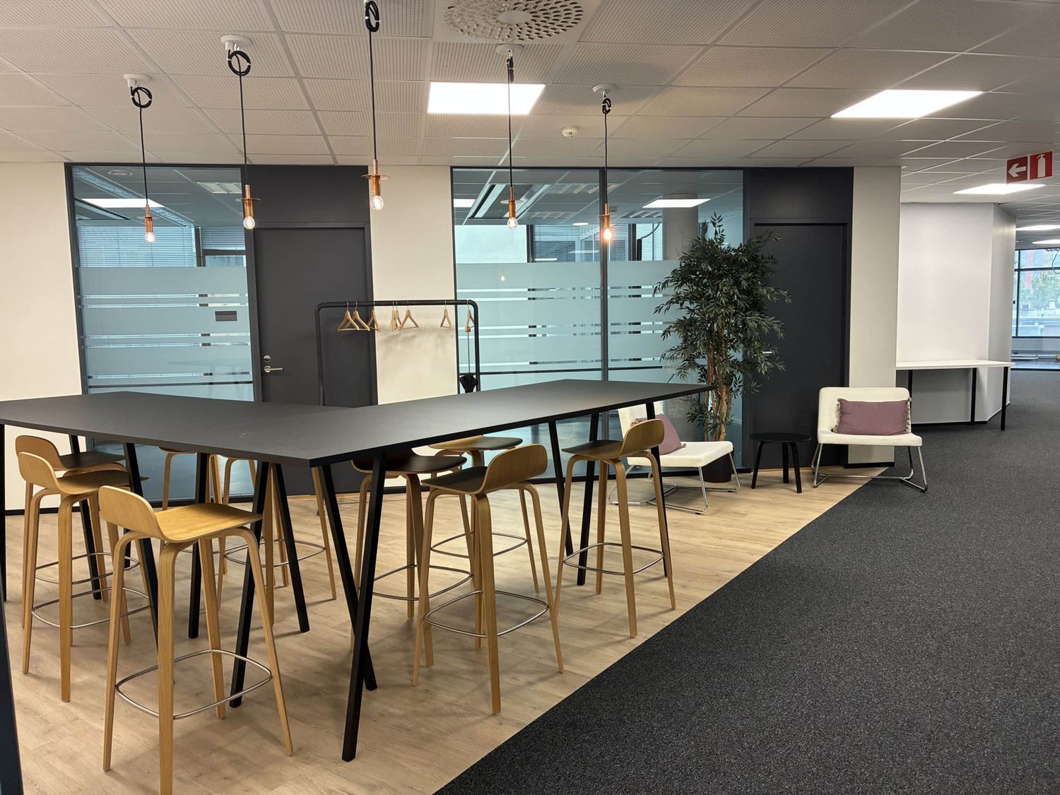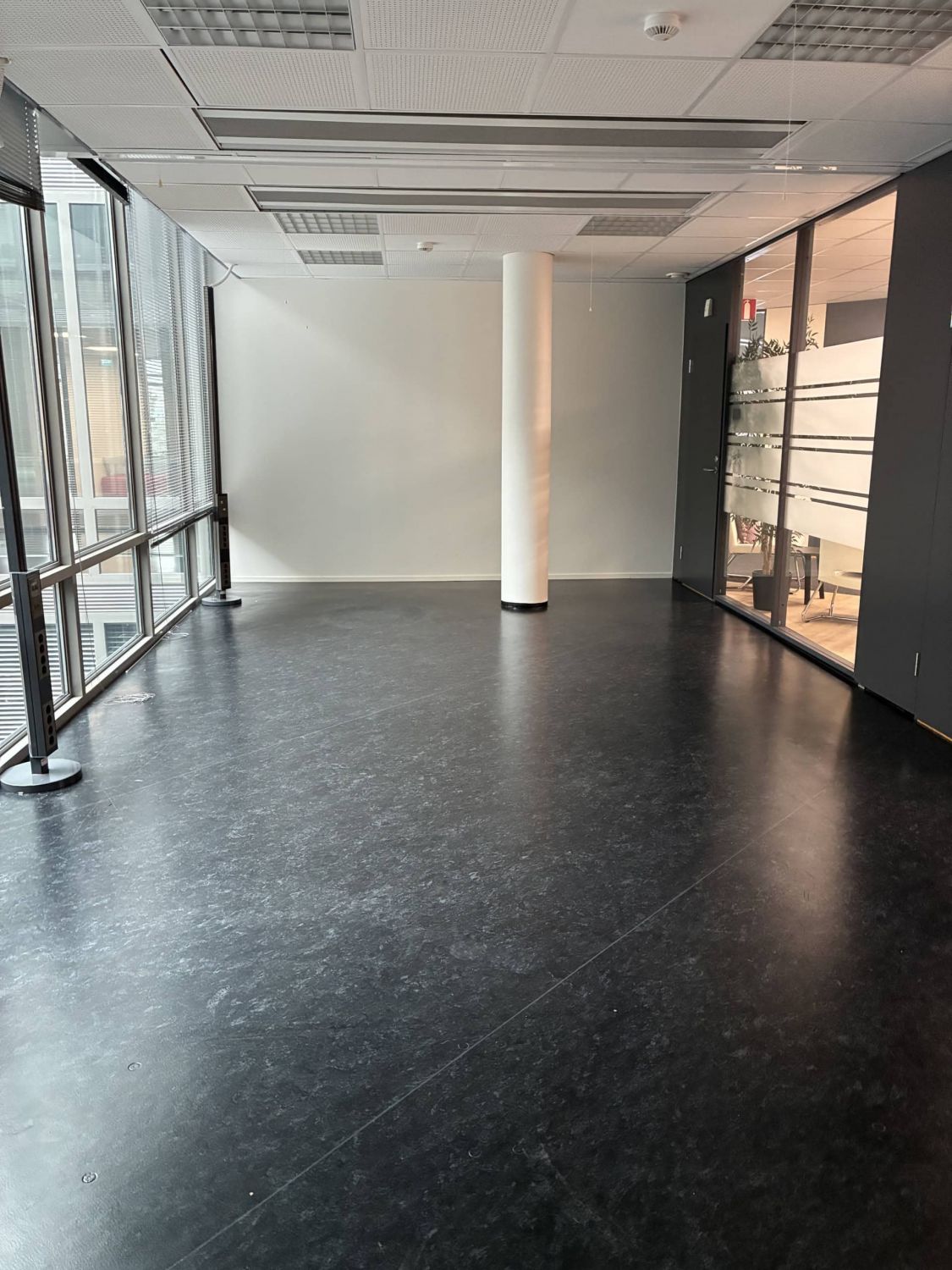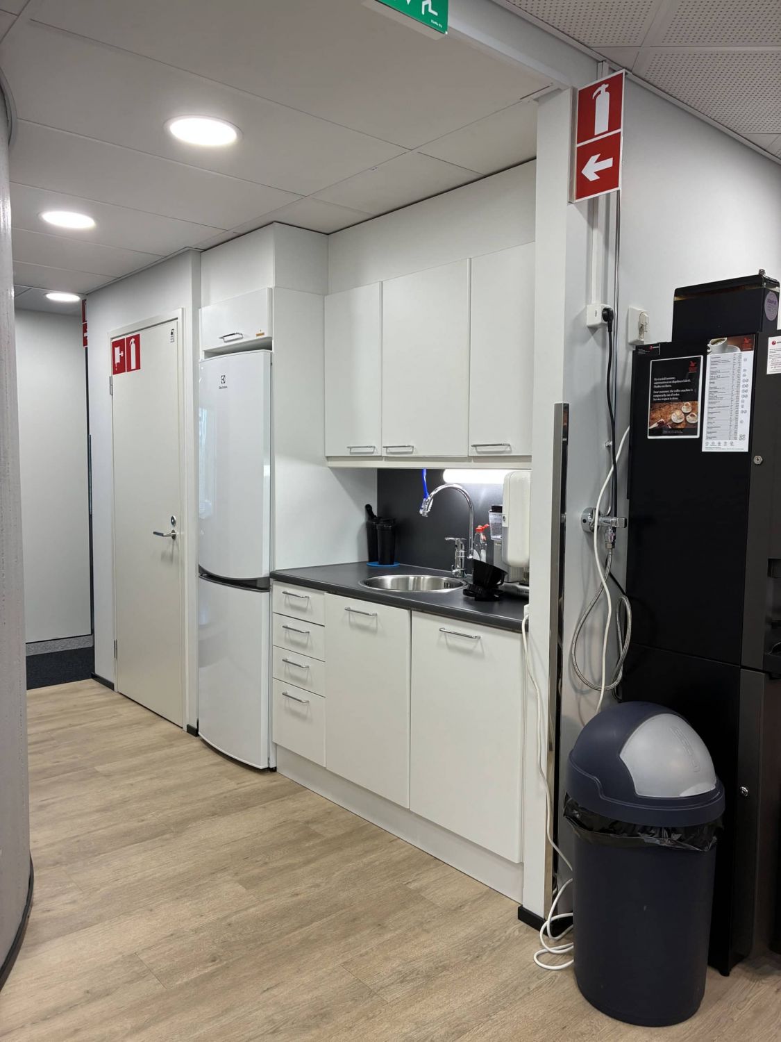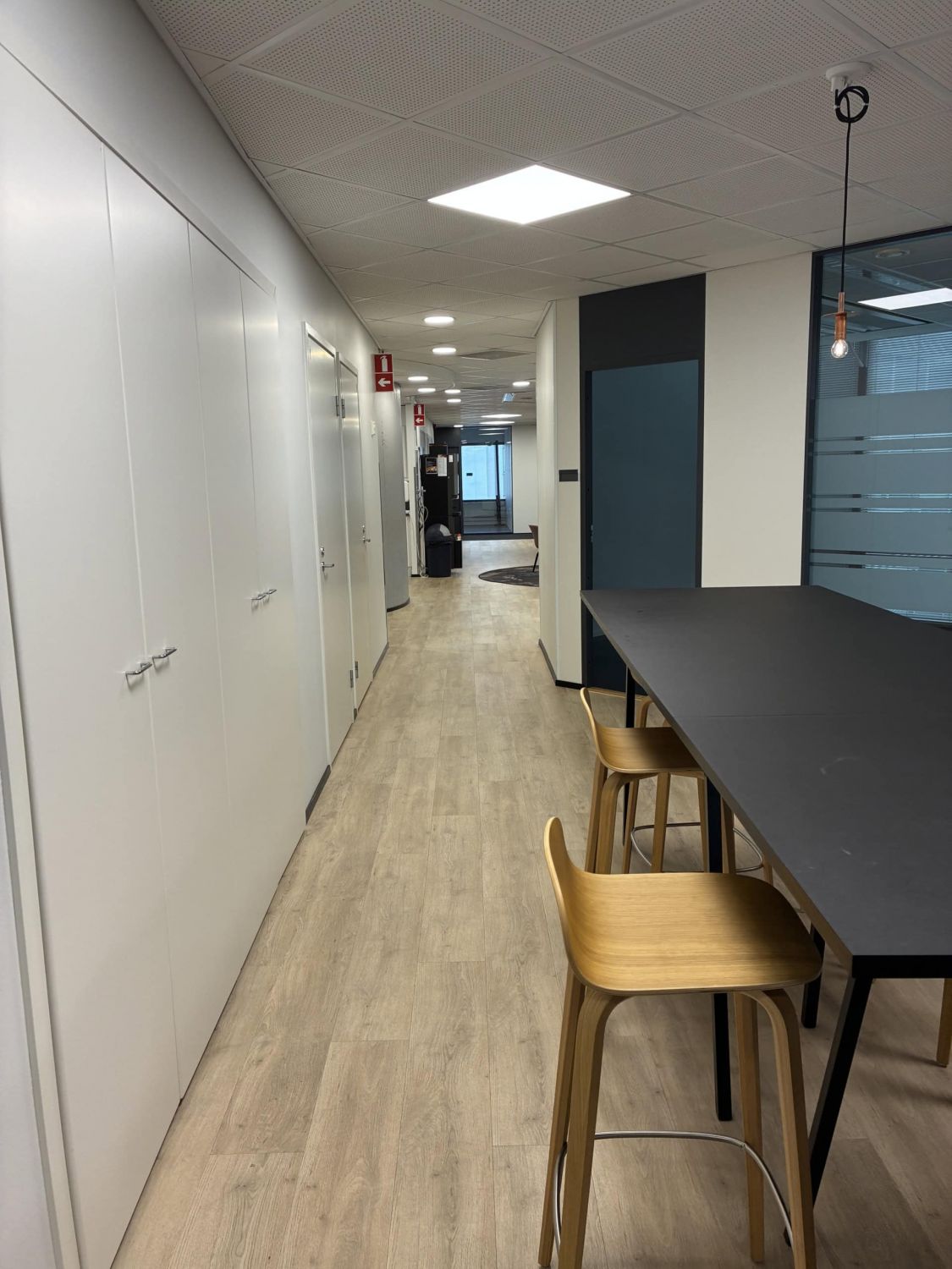 Erikokoisia huoneita, isot aula- ja oleskelutilat, muutama erikokoinen neukkari, keittiöseinäke (kahviautomaatti) ja wc-tilat.