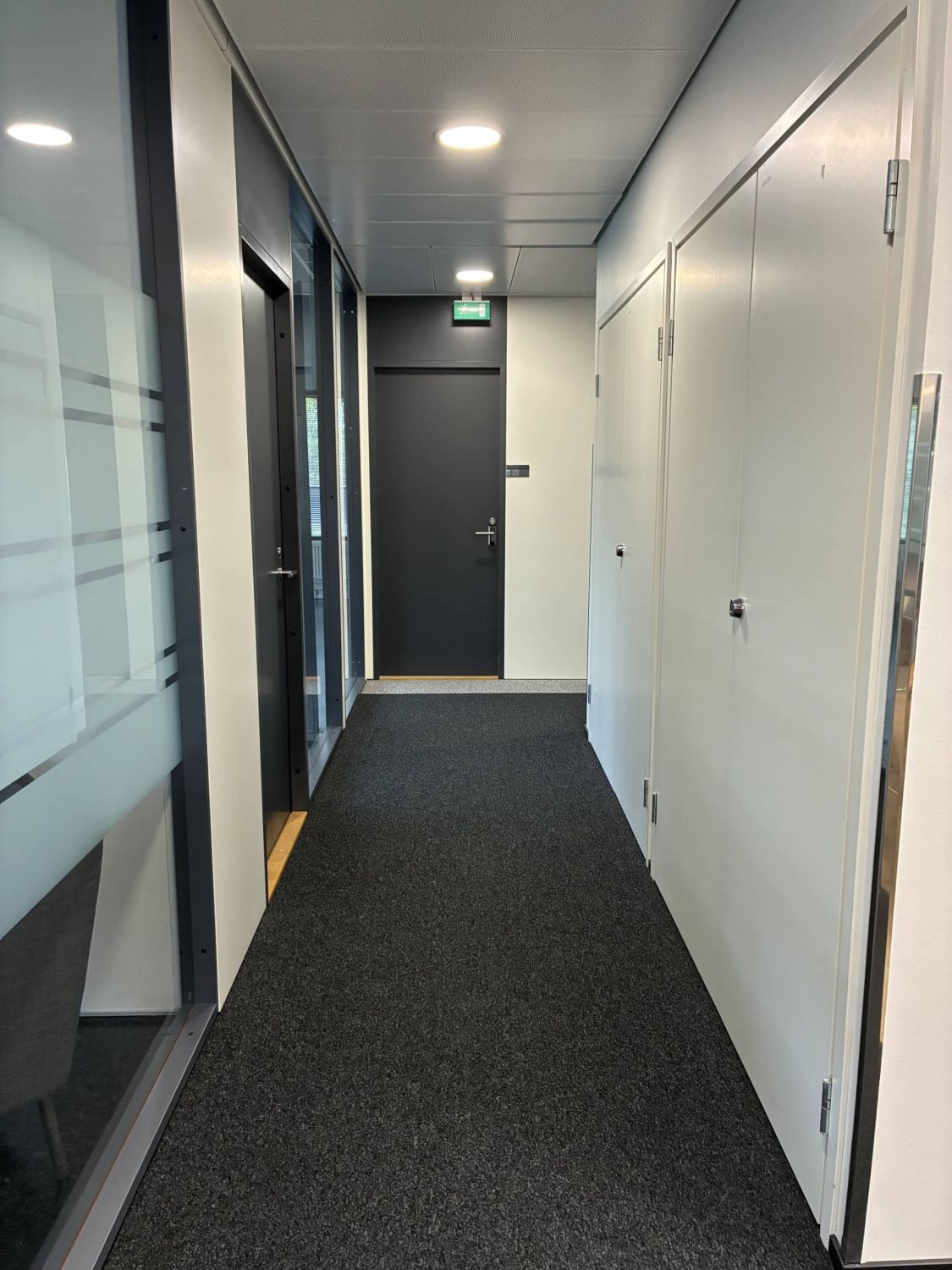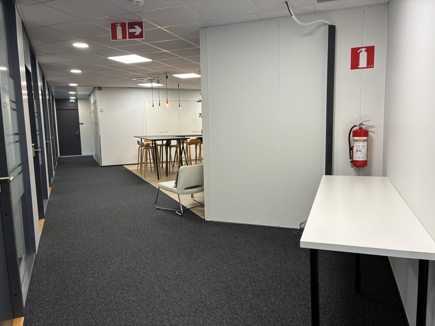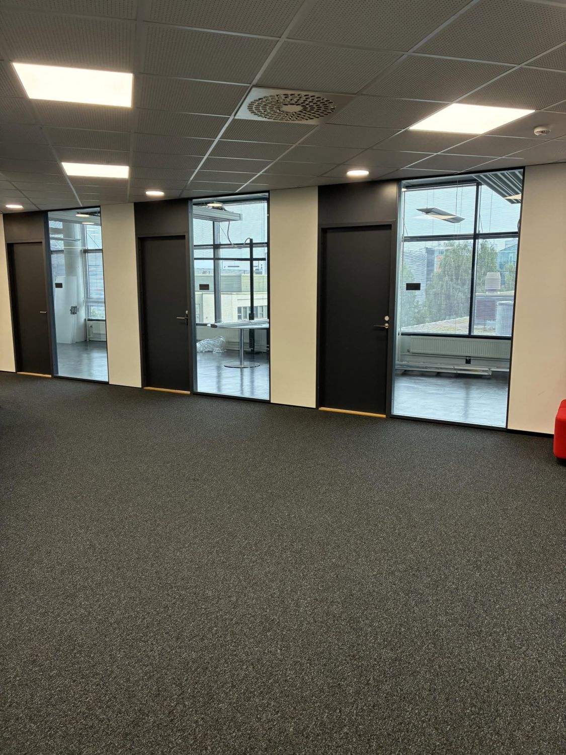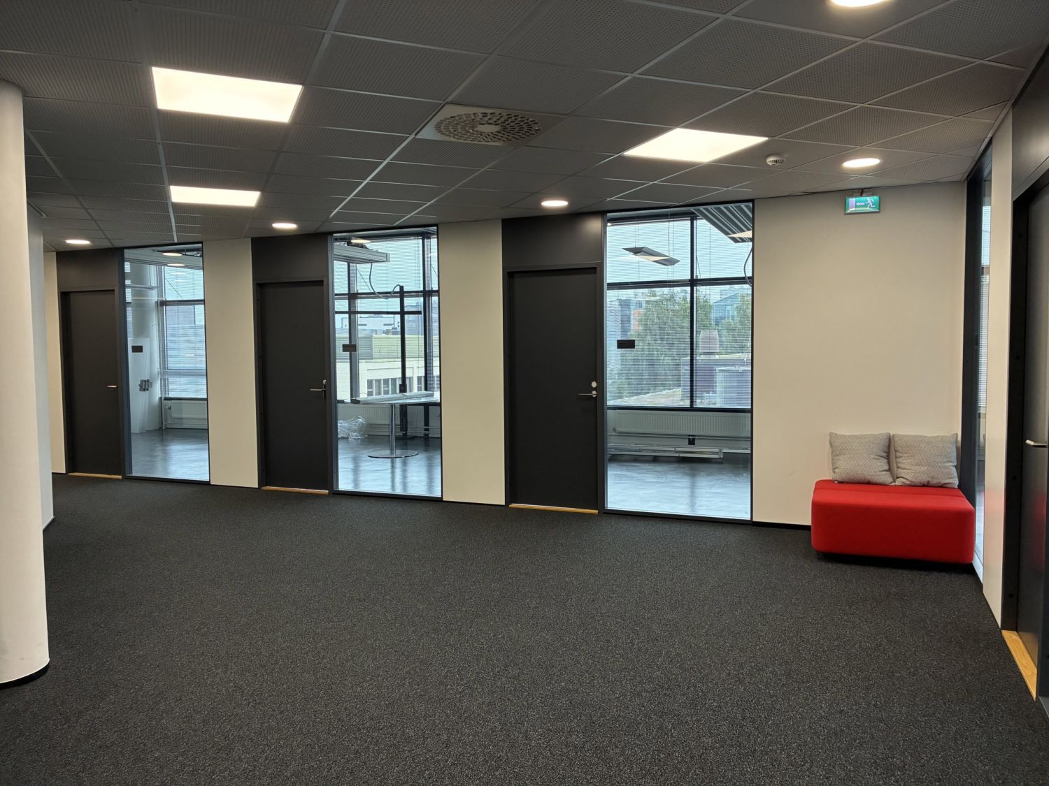 Isot aula- ja oleskelutilat, muutama erikokoinen neukkari, keittiöseinäke (kahviautomaatti) ja wc-tilat.