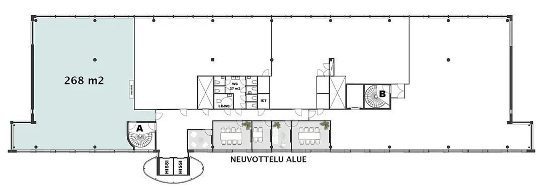 Tilat ovat valoisia ja tehokkaasti suunniteltuja, ja kiinteistössä on kaikki tarvittavat palvelut sujuvaan arkeen. Läheltä löytyvät myös monipuoliset palvelut ja lounasvaihtoehdot, jotka tukevat työpäivän sujuvuutta.