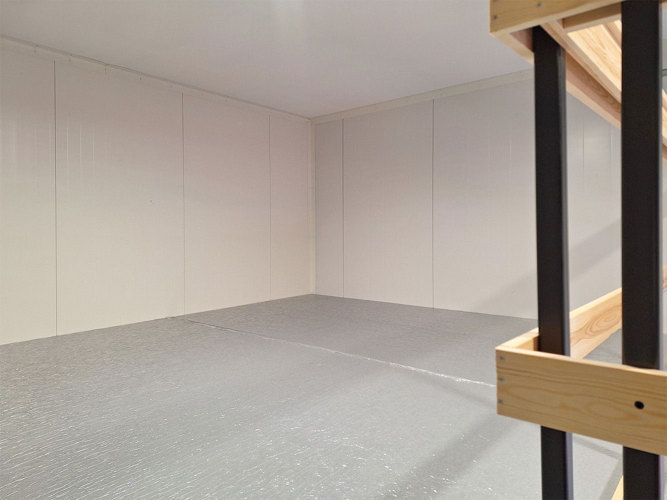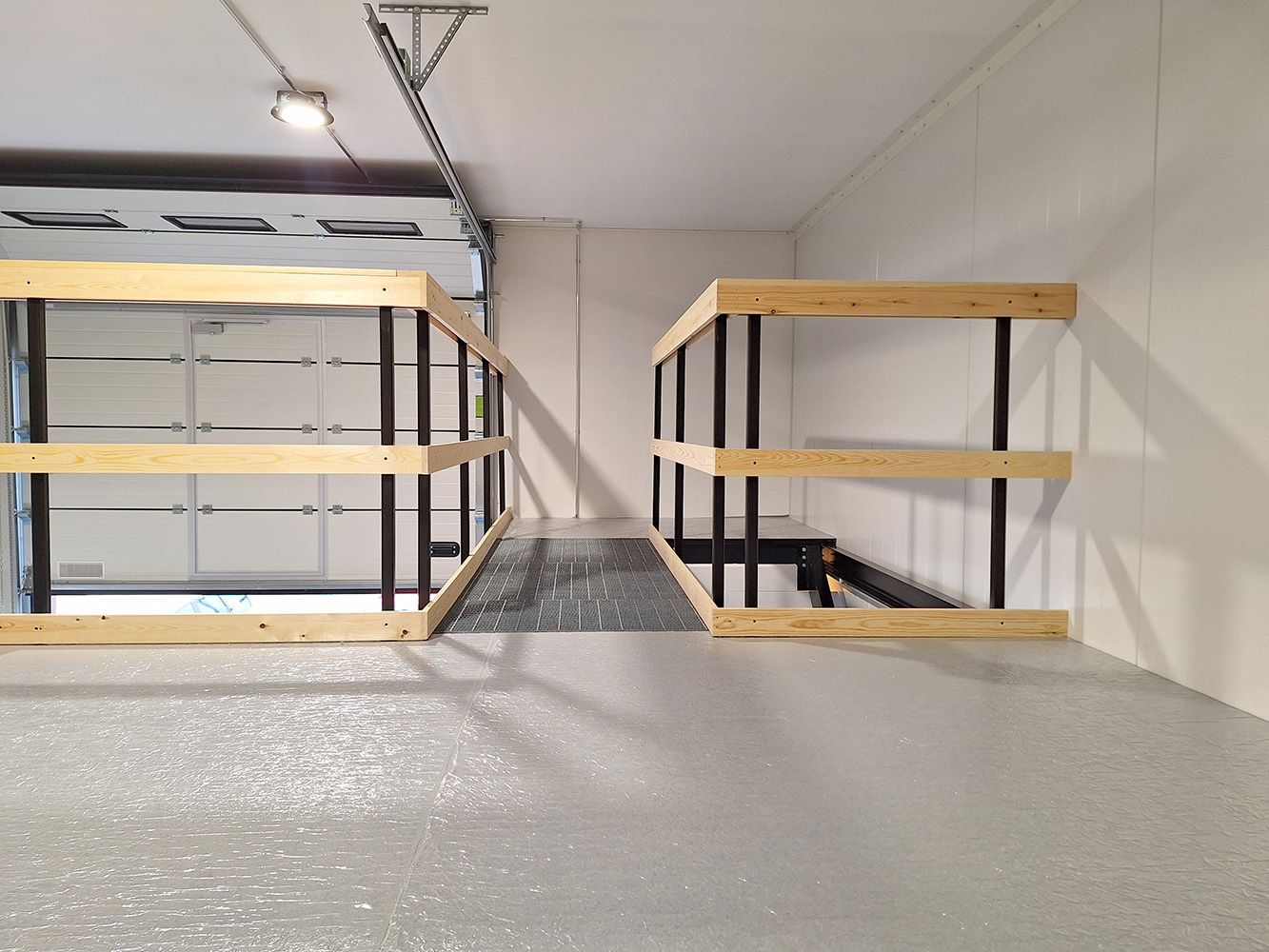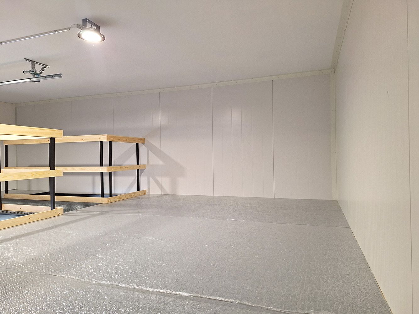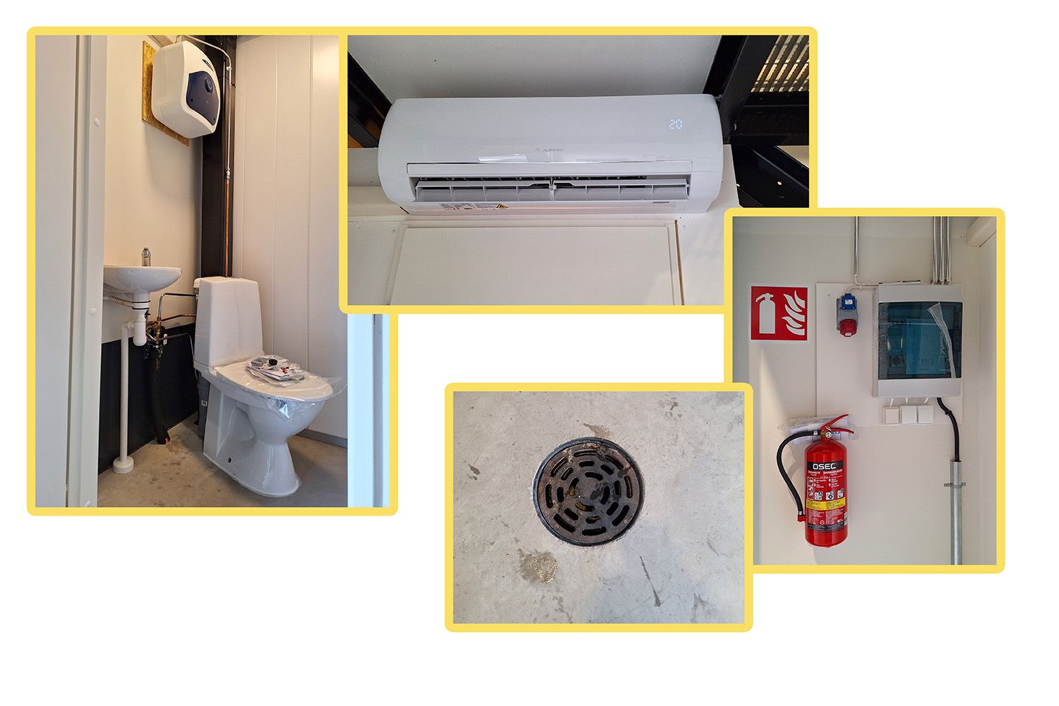 Tilassa on varusteina manuaalikäyttöinen nosto-ovi (L3,2m x K3,7m) oma wc, lattiakaivo, lämminvesivaraaja, ilmalämpöpumppu, led-valaistus ja käsienpesuallas.
