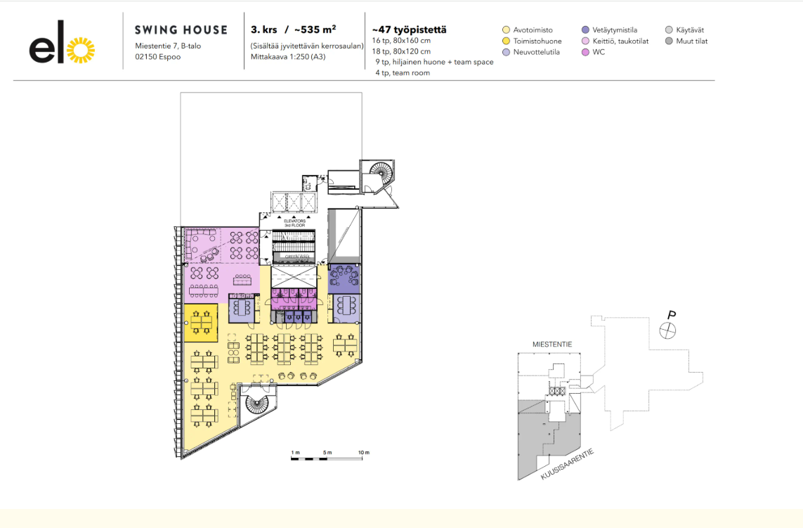 Business Center Swing. Vuokrattavissa on modernia toimistotilaa keskeisellä sijainnilla aivan Keilaniemen ja Otaniemen metroasemien ja raidejokerin läheisyydessä. Valoisa, ekologinen ja vehreä toimistotalo rakentuu luonnonmukaisista materiaaleista. Kiinteistössä tulee toimimaan myös 260-paikkainen hotelli. Swingissä on kattavat oheispalvelut kuten; - vastaanotto, - neuvottelukeskus, -viihtyisät lounge tilat, - kuntosali jne. Swing House tarjoaa vuokrattavia tiloja alkaen 20 hengen yrityksistä aina suurienkin organisaatioiden tilatarpeisiin. Yhden kerroksen pinta-ala on noin 900m2 ja se voidaan jakaa neljään osaan. Ota yhteyttä ja sovi esittely, palvelumme on tilanhakijalle maksutonta.