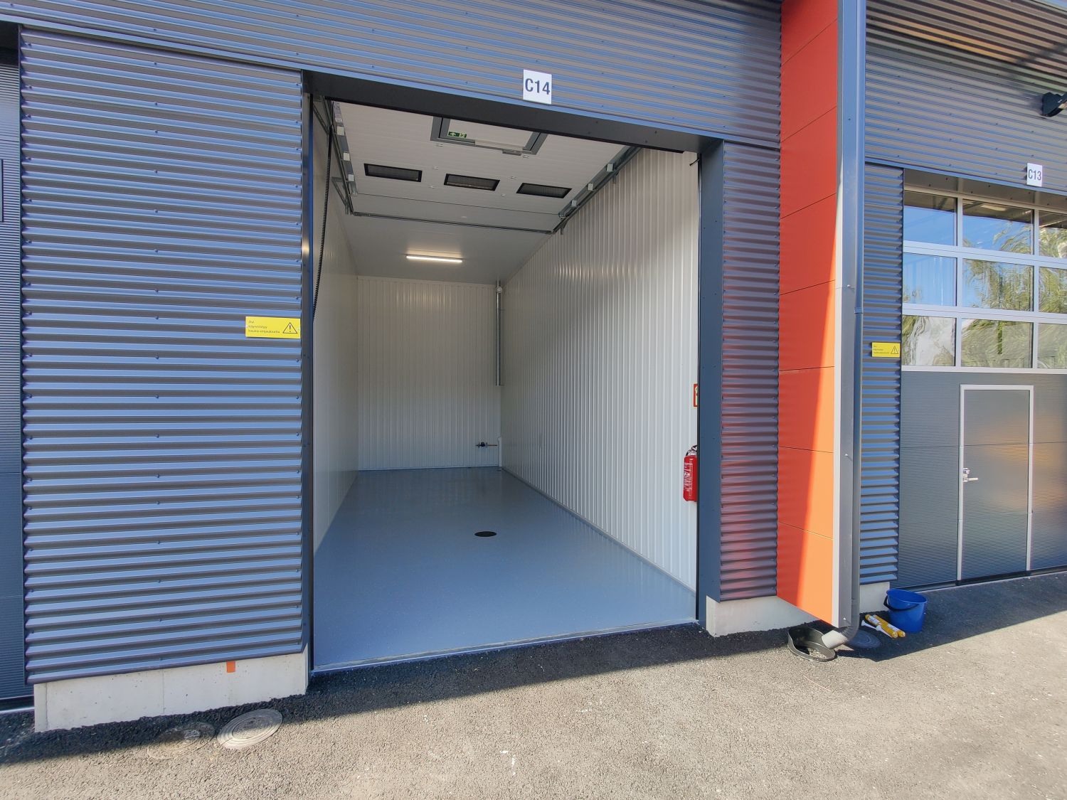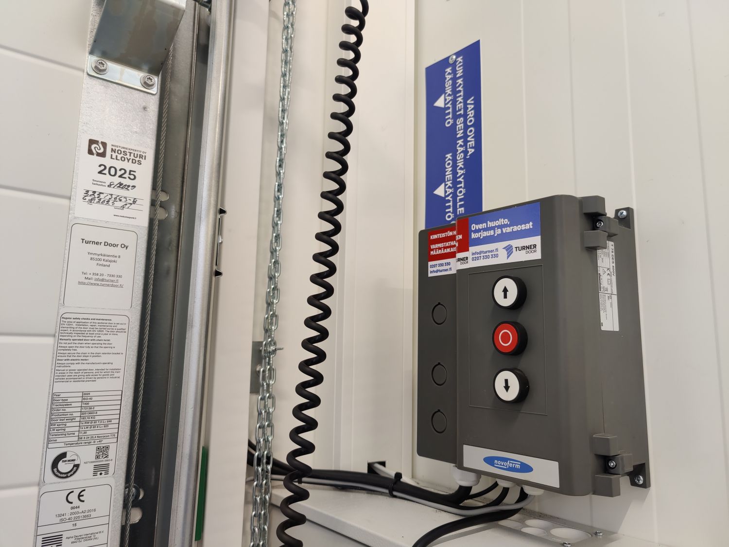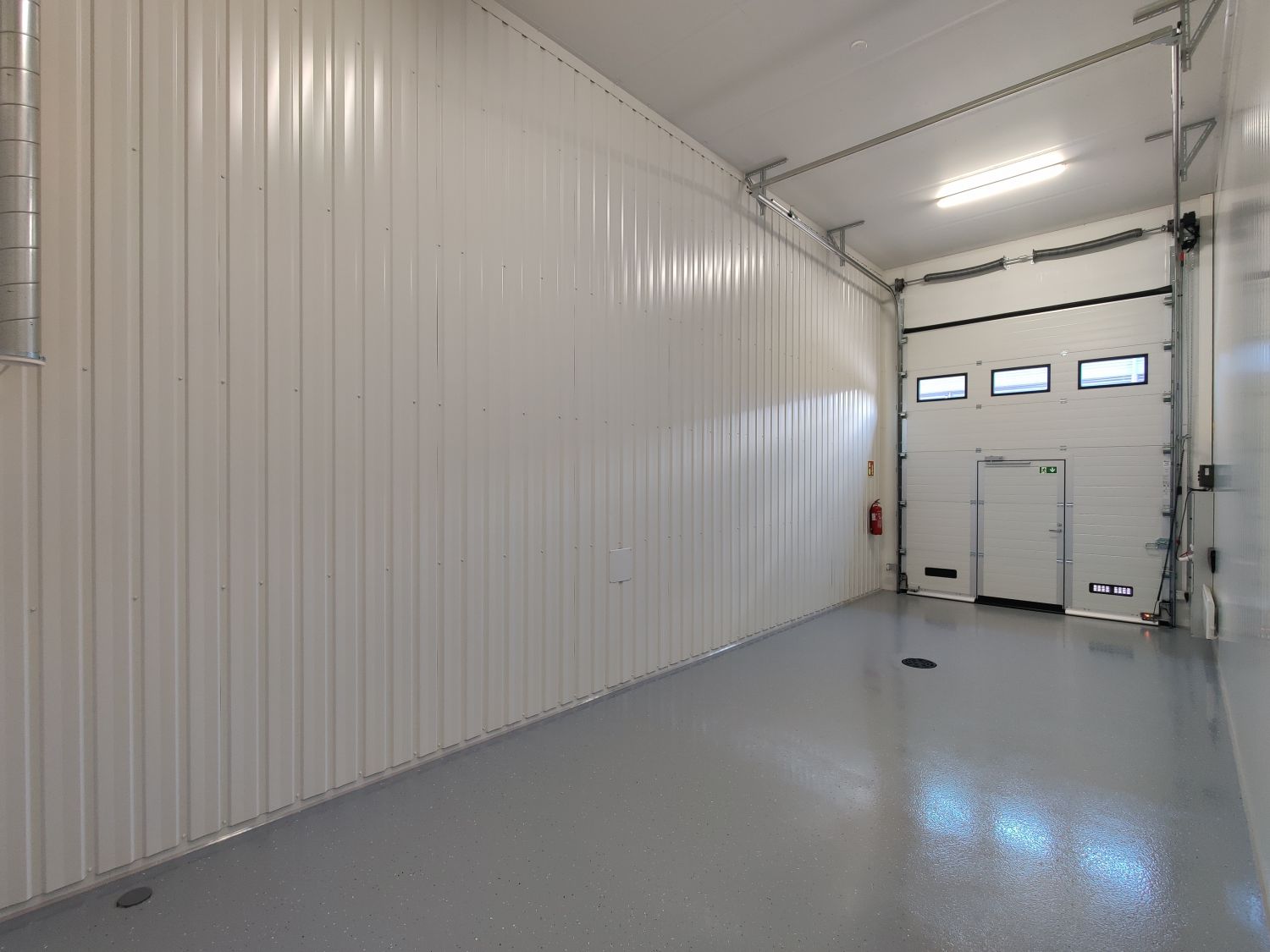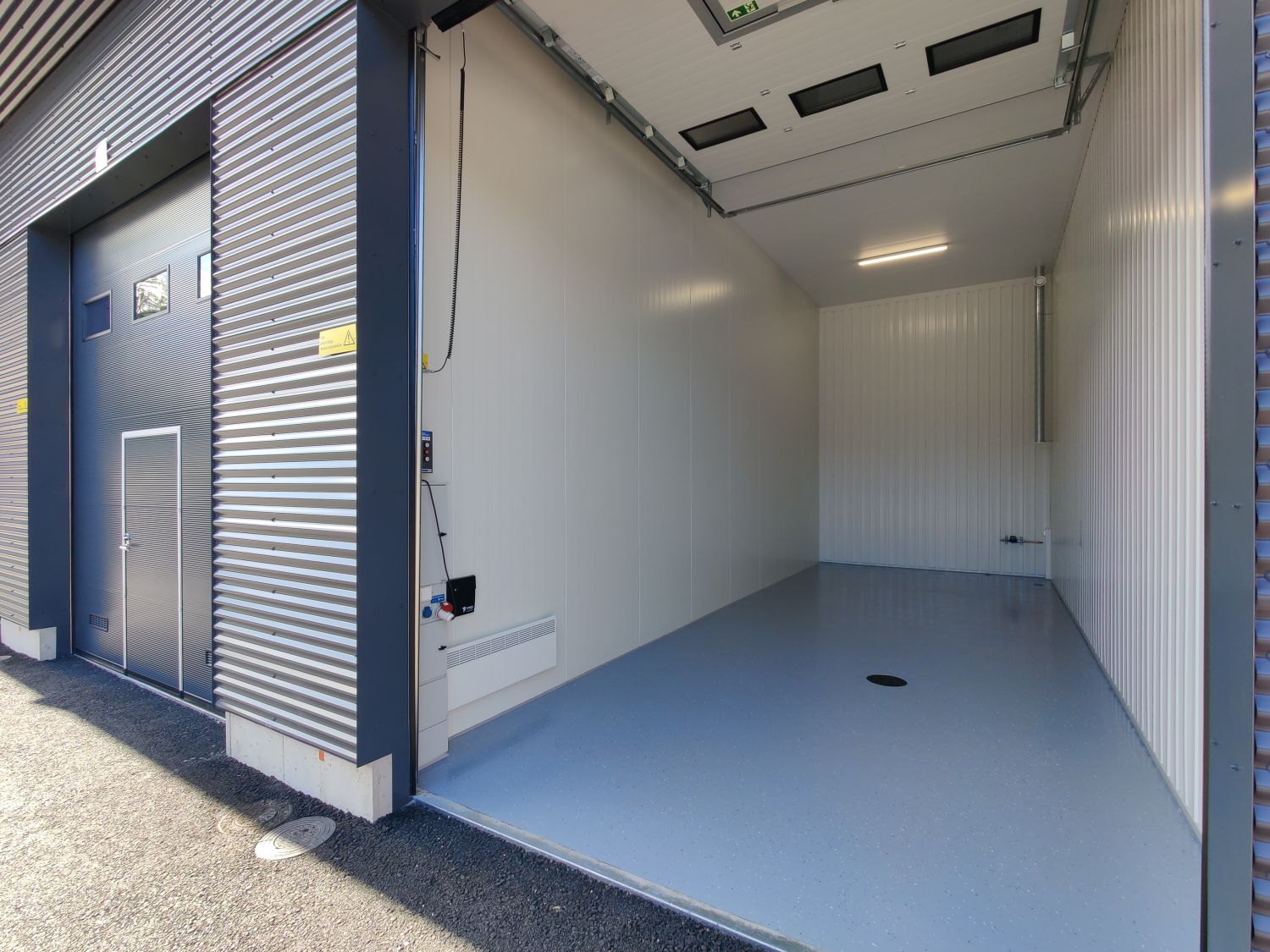 Moottoroitu nosto-ovi erillisellä käyntiovella. Autolla sisään ajettava tila. Tilamitat: 9,83 (Pituus) 3,71 (Leveys) 5,00 (Korkeus). Ovimitat: 3,00 (Leveys) 3,90 (Korkeus).