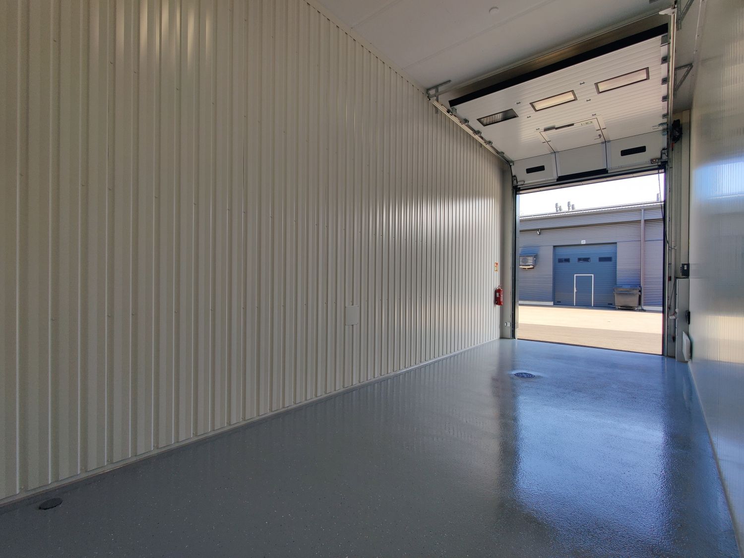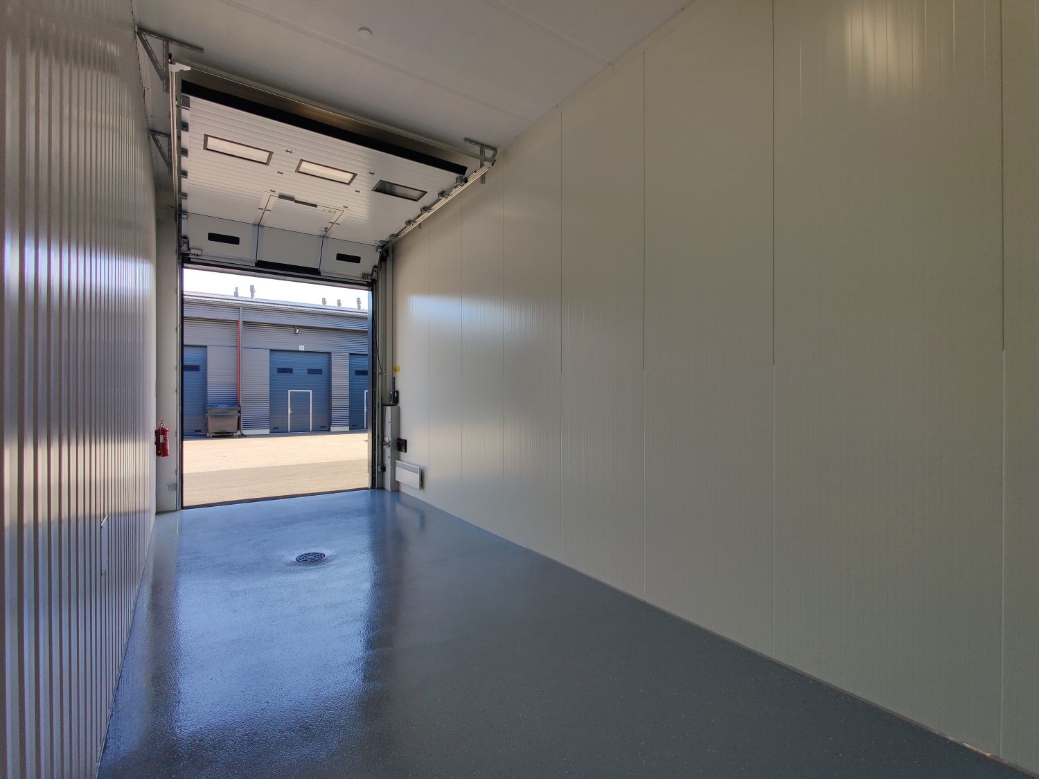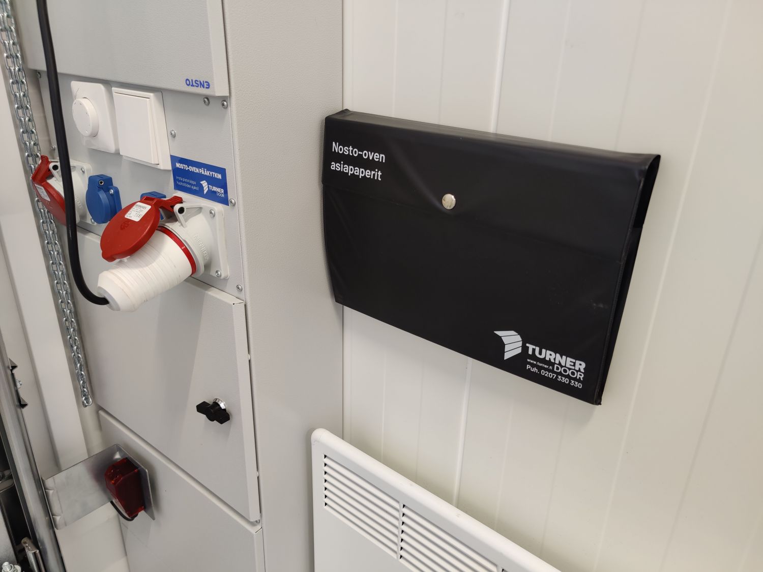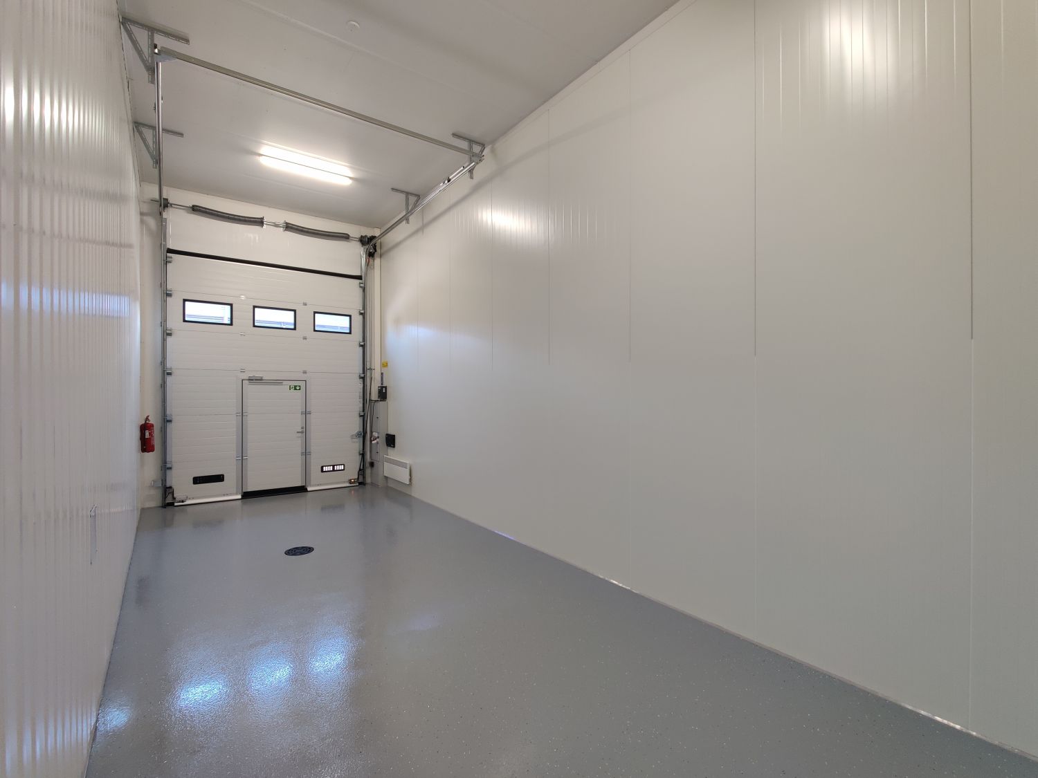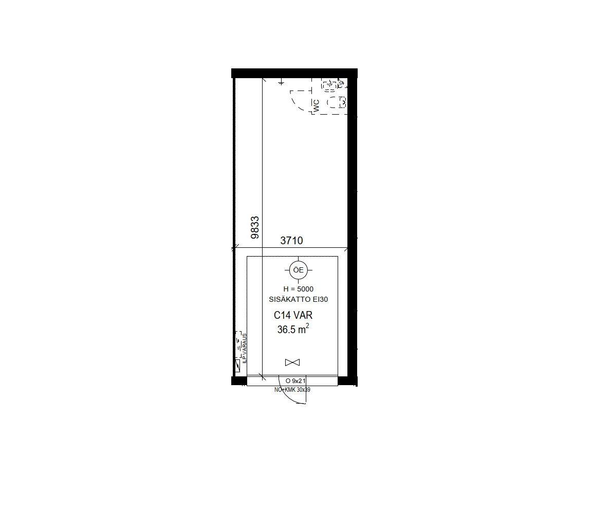 Moottoroitu nosto-ovi erillisellä käyntiovella. Autolla sisään ajettava tila. Tilamitat: 9,83 (Pituus) 3,71 (Leveys) 5,00 (Korkeus). Ovimitat: 3,00 (Leveys) 3,90 (Korkeus).