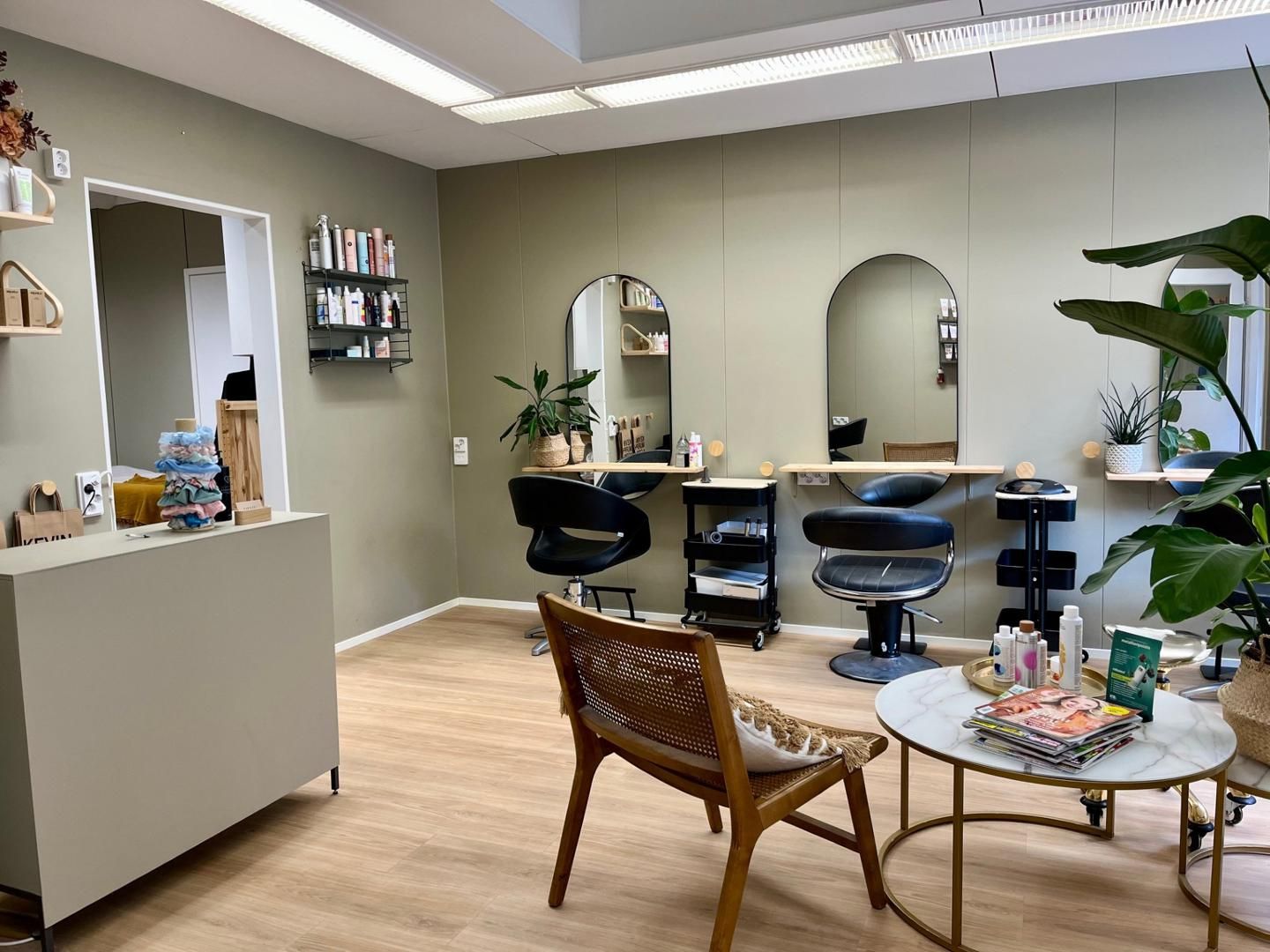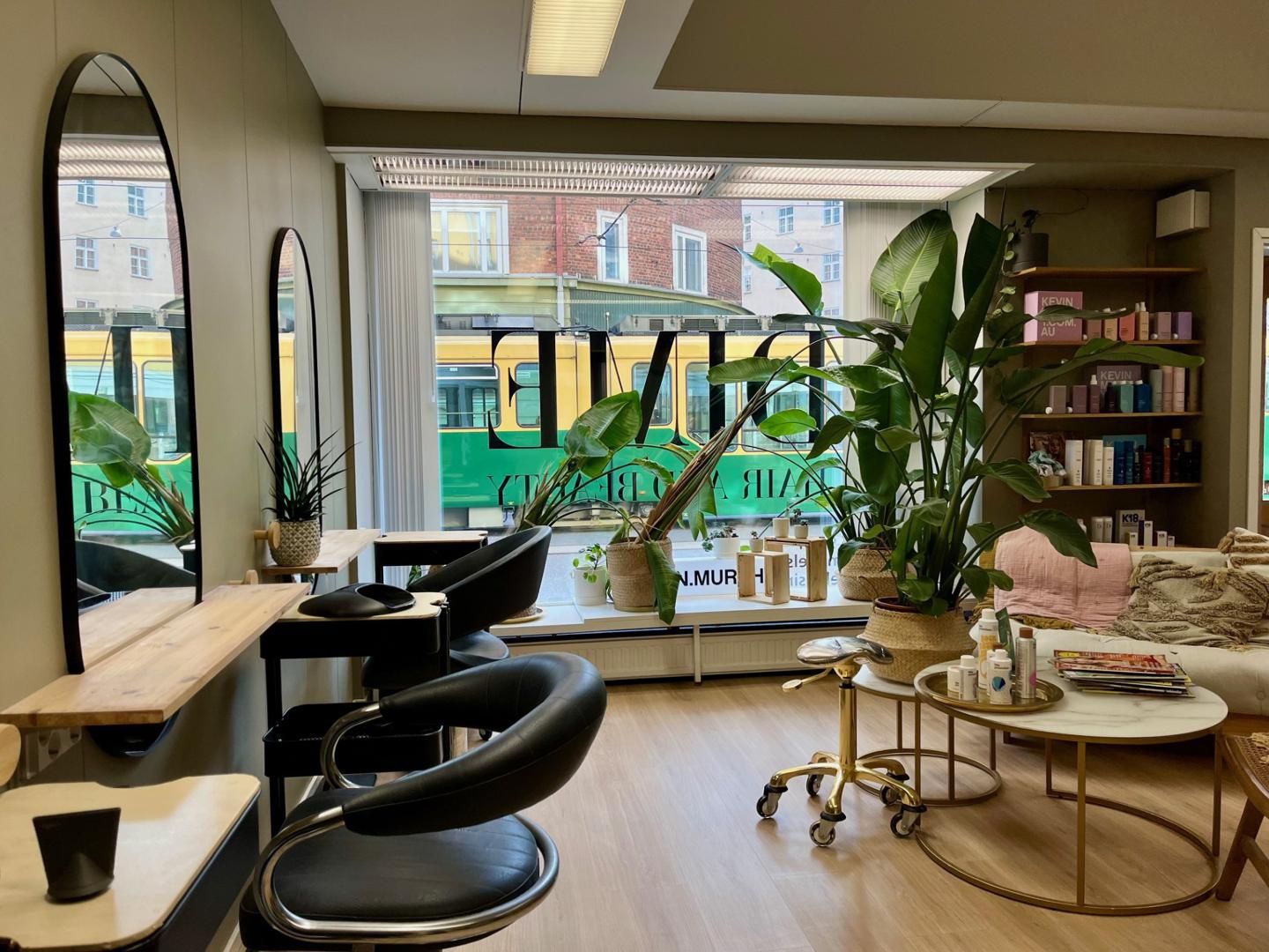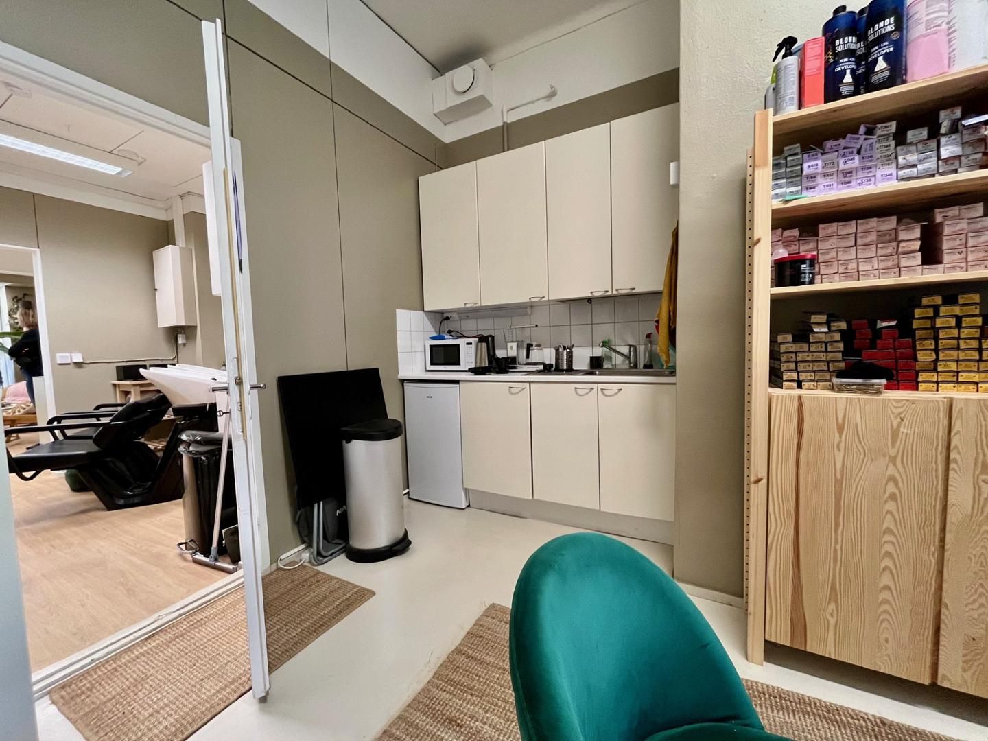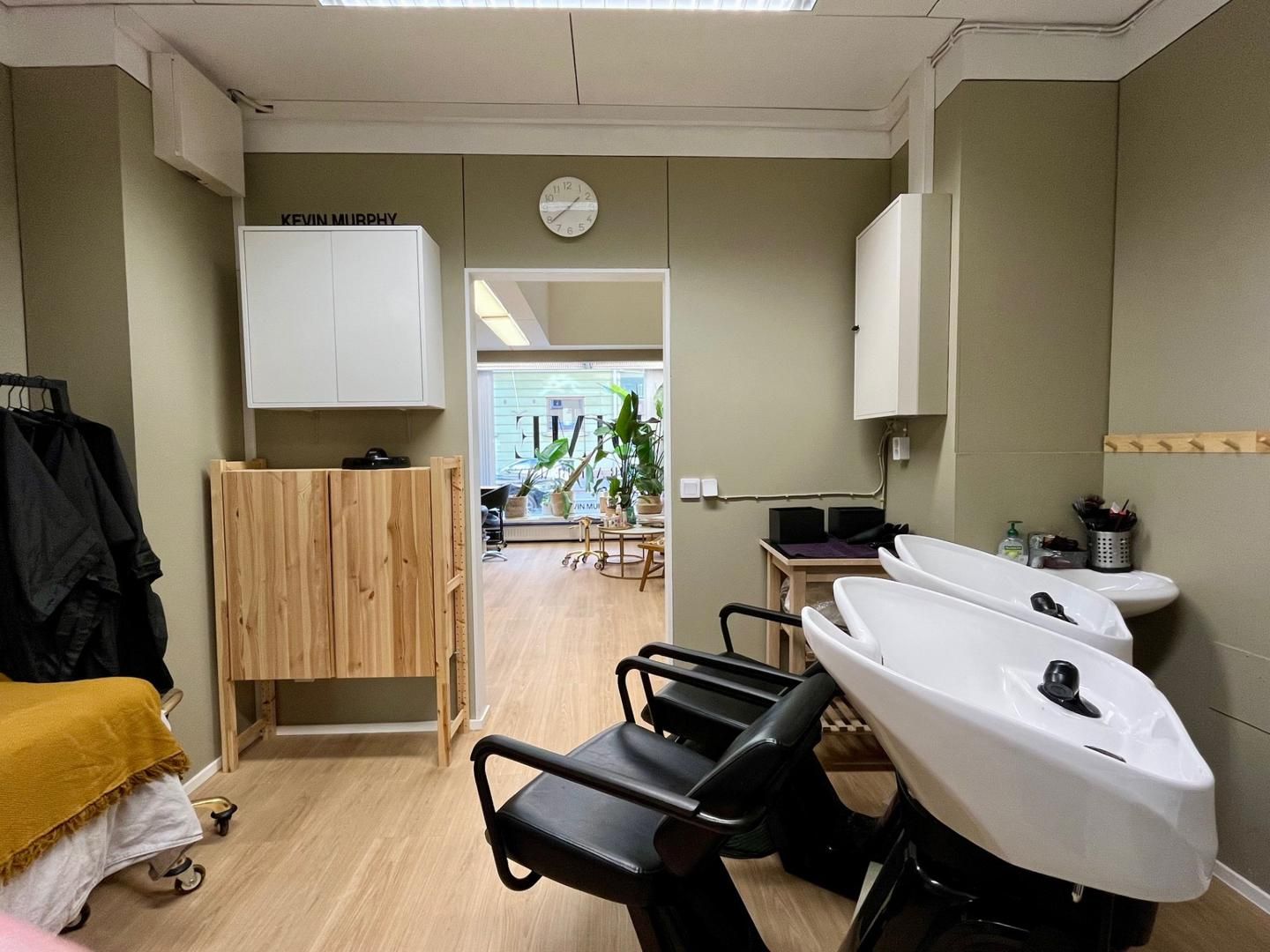 Tilan etuosassa sijaitsee valoisa kampaamotila, jossa suuri näyteikkuna avautuu vilkkaalle kadulle. Tilassa on vastaanottotiski, mukavasti odotustilaa sekä 3–4 asiakaspaikkaa. Seuraavassa huoneessa on kaksi pesupaikkaa, ja tähän huoneeseen mahtuu myös hoitopöytä sekä pesukoneet.