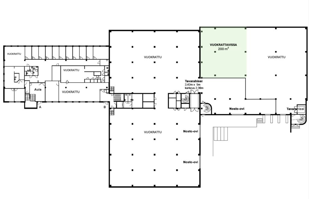 Tämä 200 m² varastotila sijaitsee kiinteistön katutasossa, ja se on noin 6 metriä korkeaa. Varastoon on lastauslaituriyhteys. Vuokrataan mieluiten 182 m² toimiston kanssa yhdessä. Vapautuminen sopimuksen mukaan.