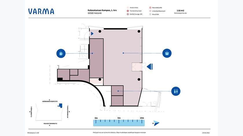 Vuokrattavana Kalasataman vilkkaimman kadun varrelta katutason liiketila. Tila sijoittuu Tukkutorinkujan ja Hermannin rantatien kulmaan, ja isoista ikkunoista on näkyvyys molemiin suuntiin. Tila on toimistotalon aulan yhteydessä.