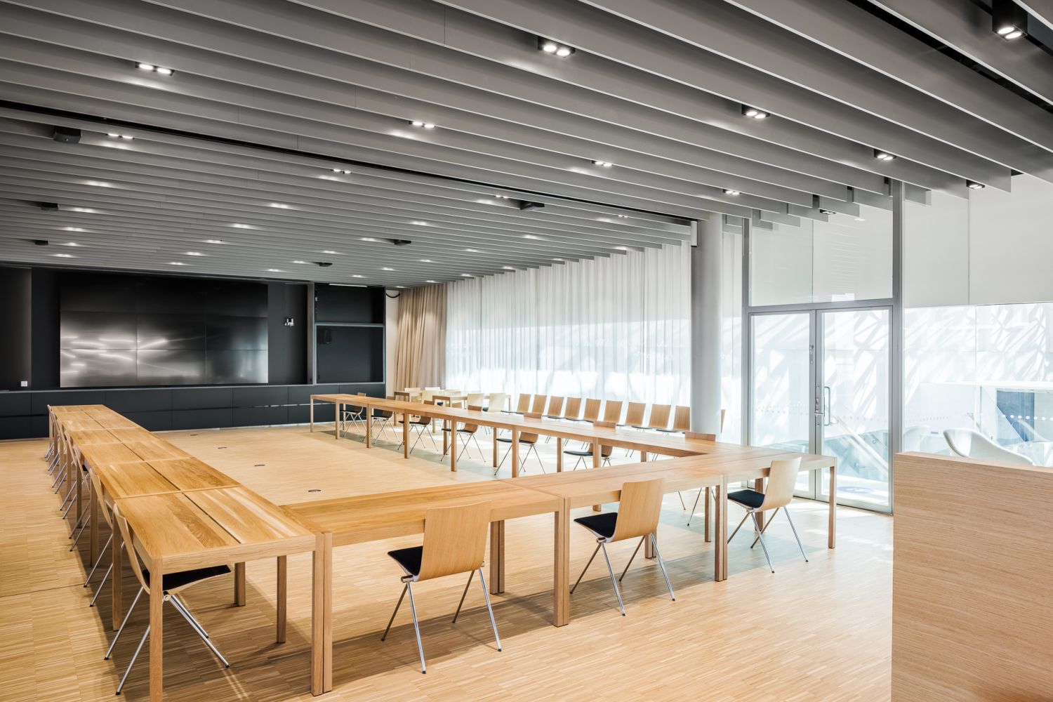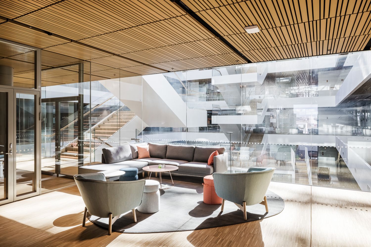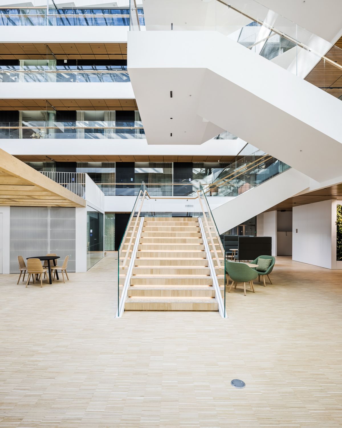Talon kerroksien toimistot kiertävät suurta valoatriumia, jolloin neuvottelutiloja on mahdollisuus rakentaa atriumin laidalle ja ikkunaseinät jättää avotilaksi.