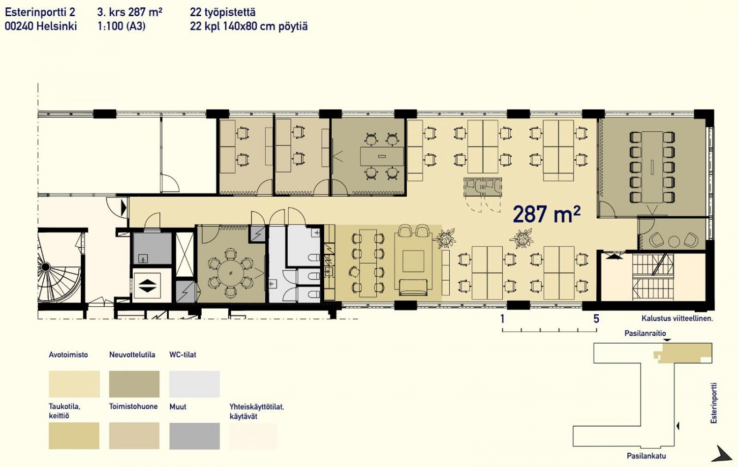 Vuokrataan Helsingin Länsi-Pasilasta kolmannen kerroksen 287 m² kalustamaton pientoimistotila. Tilatunnus C4. pohjakuvassa. Pientoimistojen yhteydessä on kolme yhteiskäyttöistä neuvotteluhuonetta ja niitä palvelevat keittiö sekä WC-tilat.