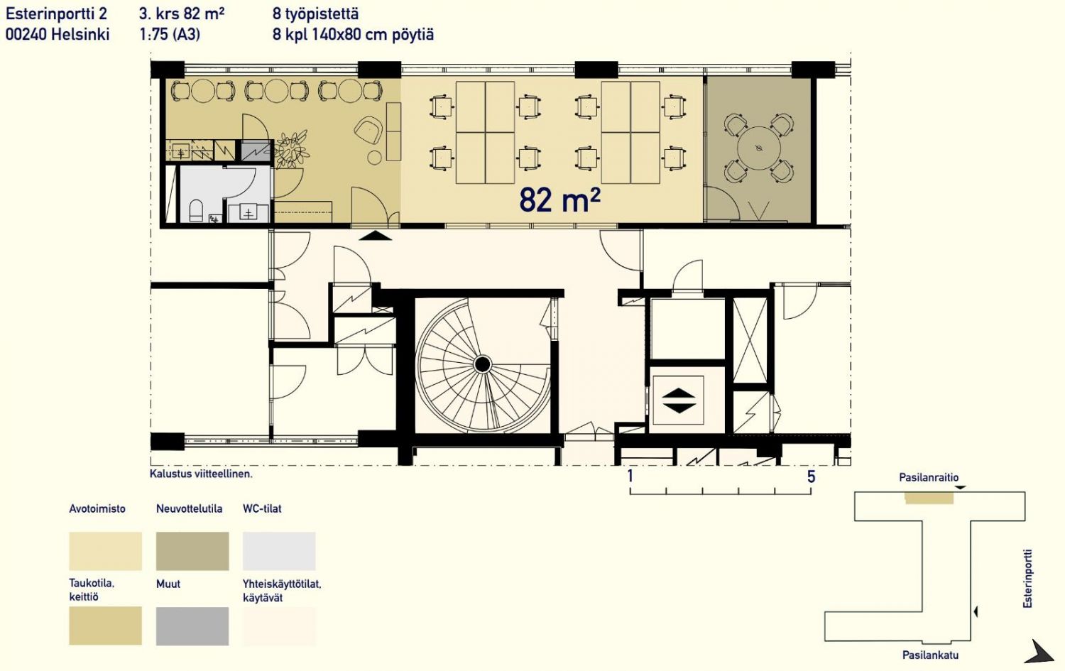 Vuokrataan Helsingin Länsi-Pasilasta kolmannen kerroksen 82 m² kalustamaton pientoimistotila. Tilatunnus C3. pohjakuvassa. Pientoimistojen yhteydessä on kolme yhteiskäyttöistä neuvotteluhuonetta ja niitä palvelevat keittiö sekä WC-tilat.