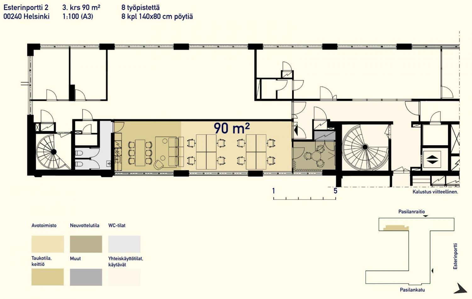 Vuokrataan Helsingin Länsi-Pasilasta kolmannen kerroksen 90 m² kalustamaton pientoimistotila. Tilatunnus C2. pohjakuvassa. Pientoimistojen yhteydessä on kolme yhteiskäyttöistä neuvotteluhuonetta ja niitä palvelevat keittiö sekä WC-tilat.