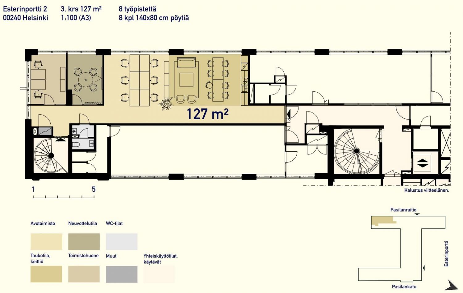Vuokrataan Helsingin Länsi-Pasilasta kolmannen kerroksen 127 m² kalustamaton pientoimistotila. Tilatunnus C1. pohjakuvassa. Pientoimistojen yhteydessä on kolme yhteiskäyttöistä neuvotteluhuonetta ja niitä palvelevat keittiö sekä WC-tilat.